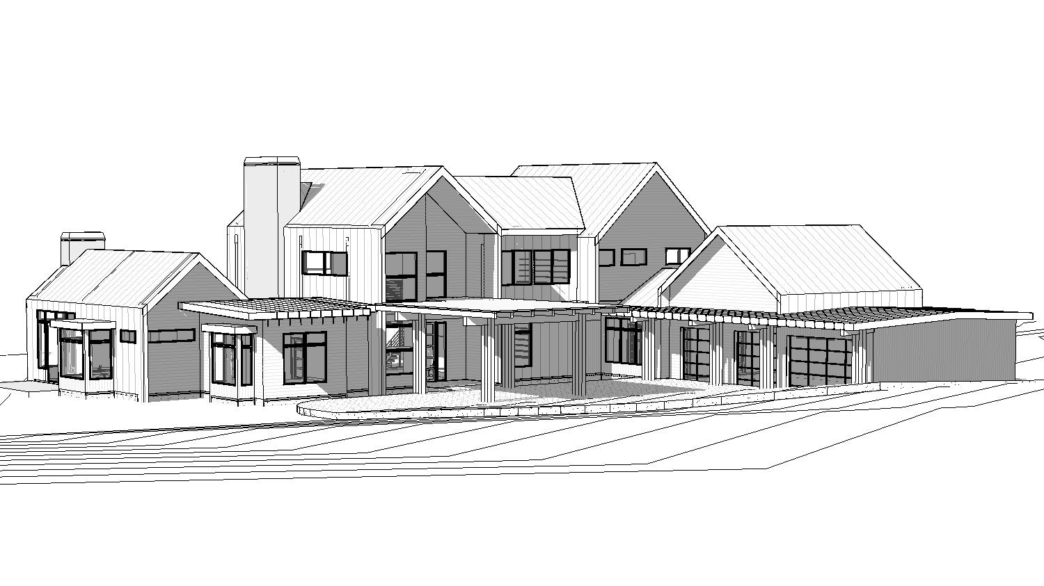 back view of a clean modern architectural exterior home rendered in cinematic vibrant golden hour lighting home in a winery setting with streaks of light coming through trees in the surrounding area warm glow and reflections off of the windows blue sky shining rustic select grade vertical wood siding green manicured landscape around structure with gardens and patches of grass black standing seam metal roof prominent trees and winery in the background high fidelity photorealistic visualization crisp shadow falloff refined facade geometry soft atmospheric depth premium architectural photography mood ultra clean composition and materials black window trim flat roof photorealistic render flat concrete driveway