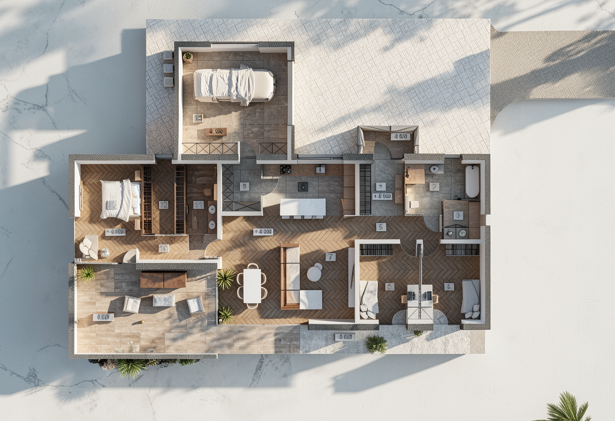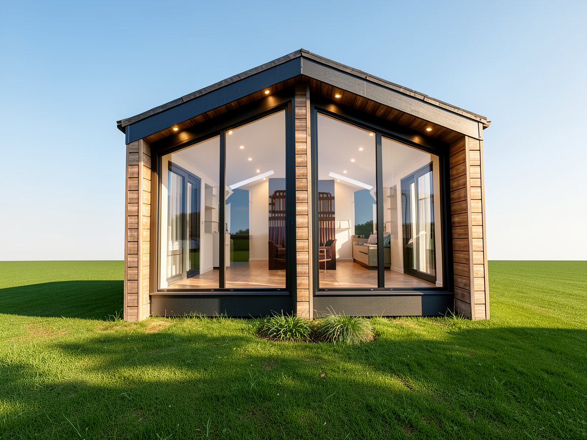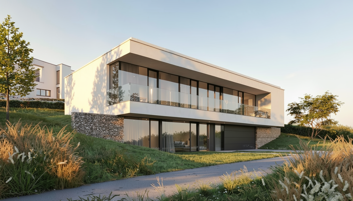 edit the uploaded house photo by changing only the surroundings remove all background elements such as buildings cars fences trees people and any other objects replace them with a calm minimal environment flat green grass and a clean clear sky keep the house completely unchanged do not modify the building shape proportions roof window and door layout or architectural details do not change the facade layout or texture the facade must remain light brown preserve this color and do not alter it do not enhance or stylize the house the house must remain exactly as in the original image match lighting perspective and shadows so the new environment blends naturally with the house realistic style high quality natural colors no artifacts