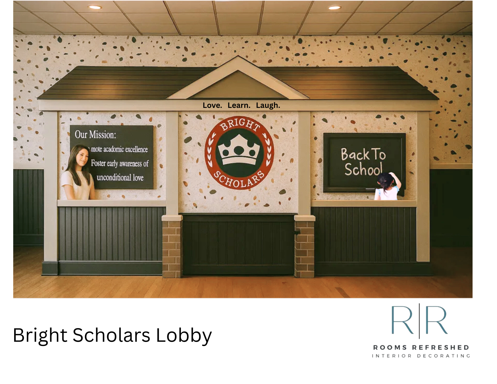 make this look more realistic it is for a lobby for a preschool create it so it looks inviting to prospective parents to sit in while they wait