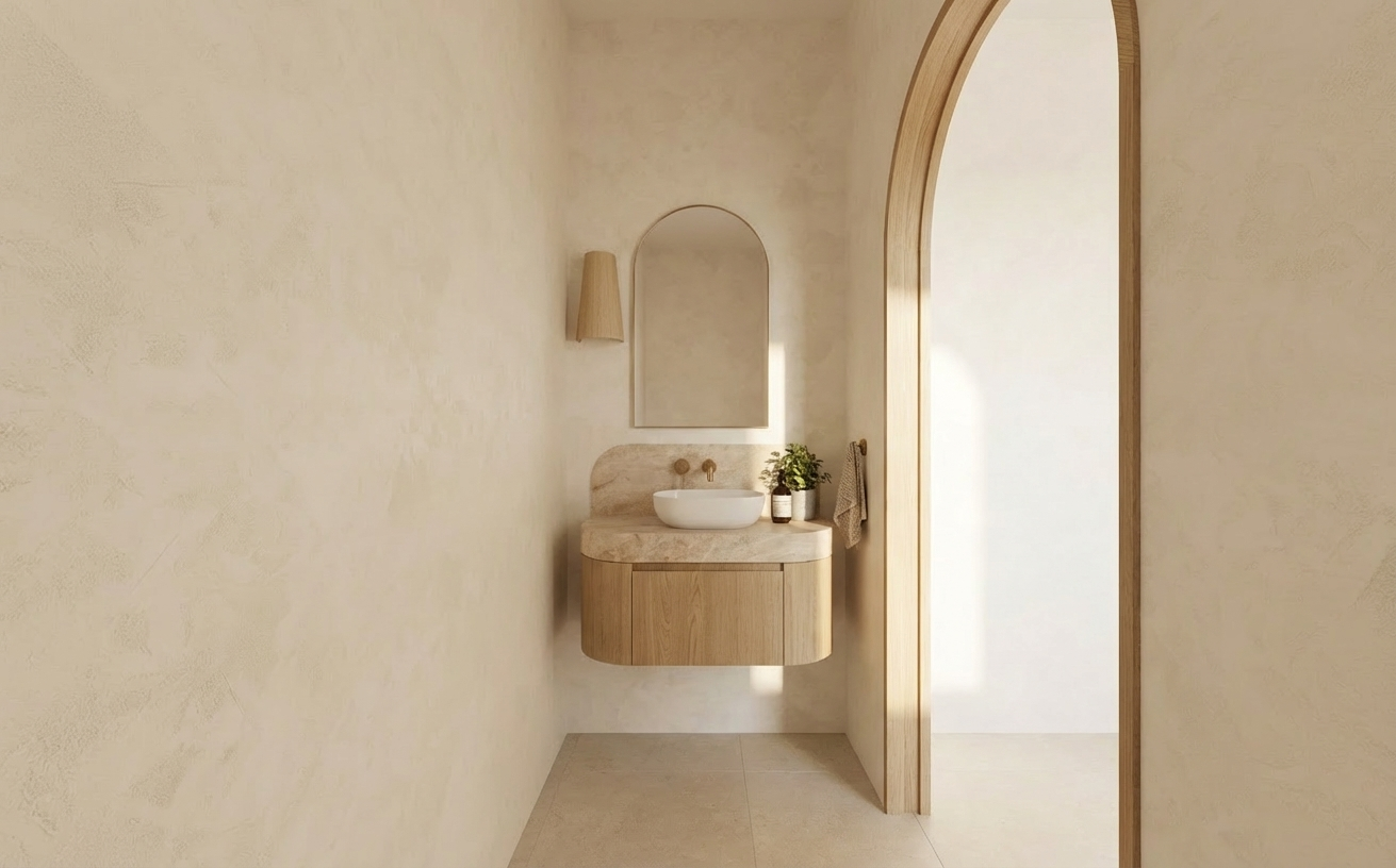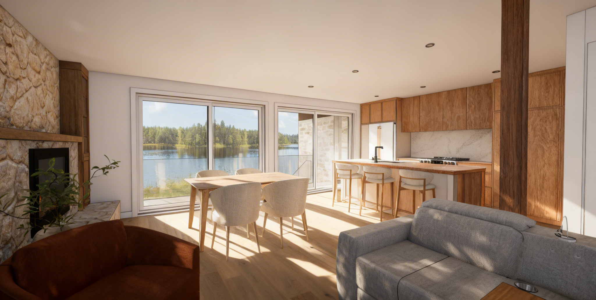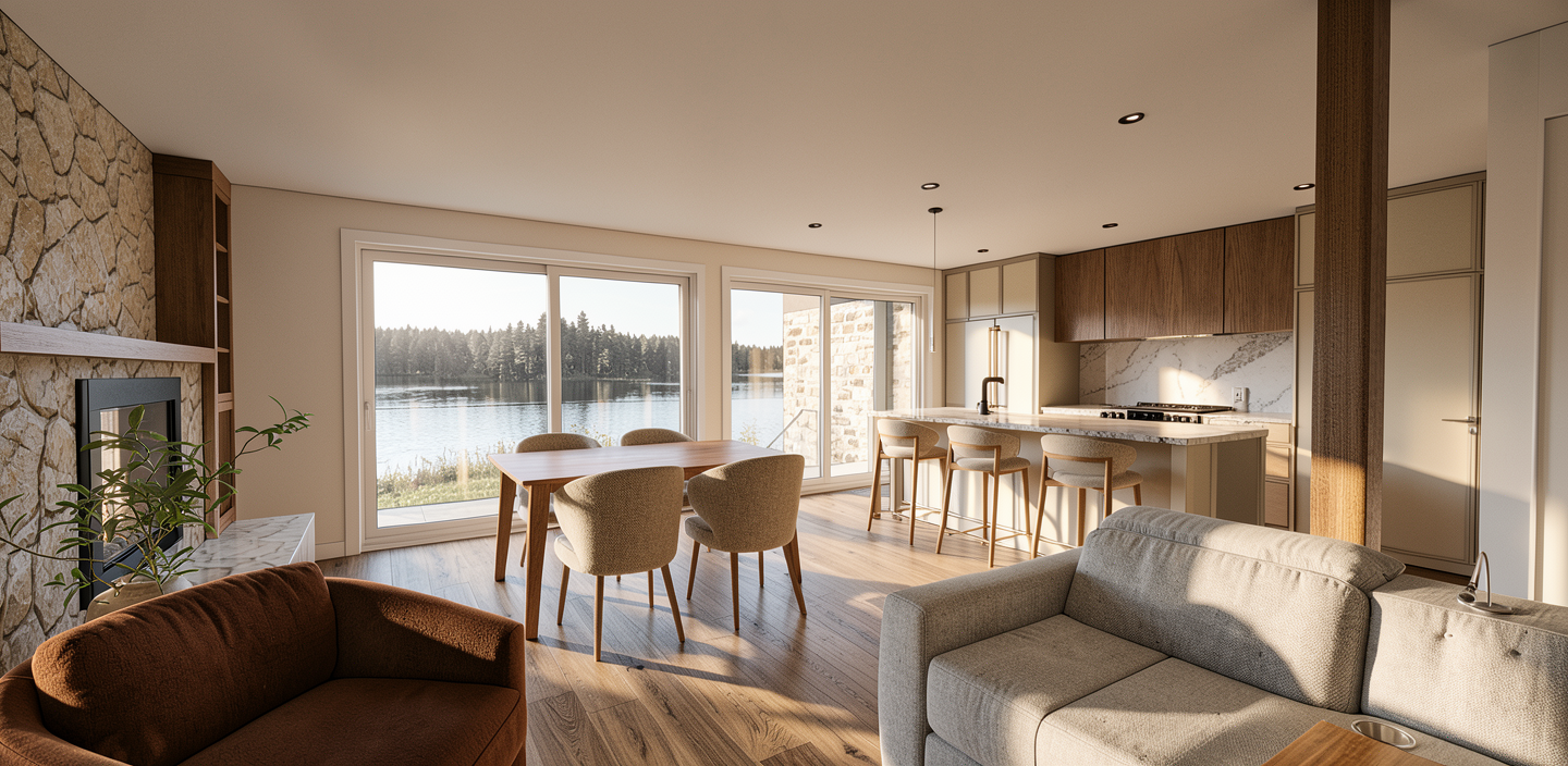 add light from the recessed lights add some accessories on the kitchen counter add some appetizers wine glasses and a bottle of red wine on the counter make the light level in the kitchen a little lower and warmer in color add some tea candles on the dining table the louvered shutters in the kitchen window are painted white the upper cabinets in the kitchen are white slab doors the dining table top is white marble the ceilings and walls are painted white the countertops are the same white calcutta quartz material as the backsplash do not add shutters over the glass block window do not add any lights to the ceiling add some light hitting the artwork in the distance over the sofa