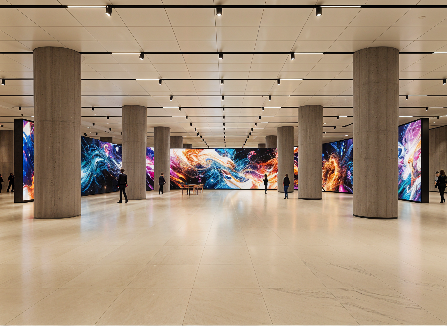 modernist interior shot a high end architectural visualization of a modern subterranean transit hub and commercial concourse the space features polished cream terrazzo flooring massive cylindrical raw concrete columns and minimalist white dropped ceilings with recessed spotlighting on the primary feature wall a seamless large scale led video wall installation displays vibrant fluid digital art casting a soft ambient glow onto the surrounding architectural surfaces the atmosphere is clean and spacious with a soft golden hour interior lighting scheme photorealistic 8k resolution shot on a 24mm wide angle lens cinematic composition unreal engine 5 style render architecture