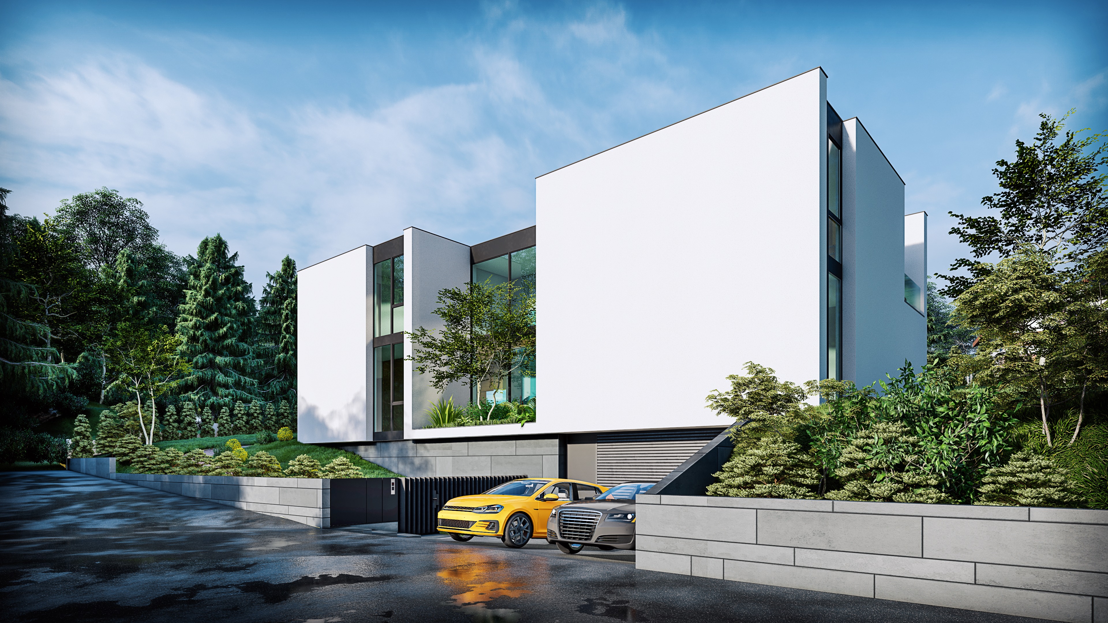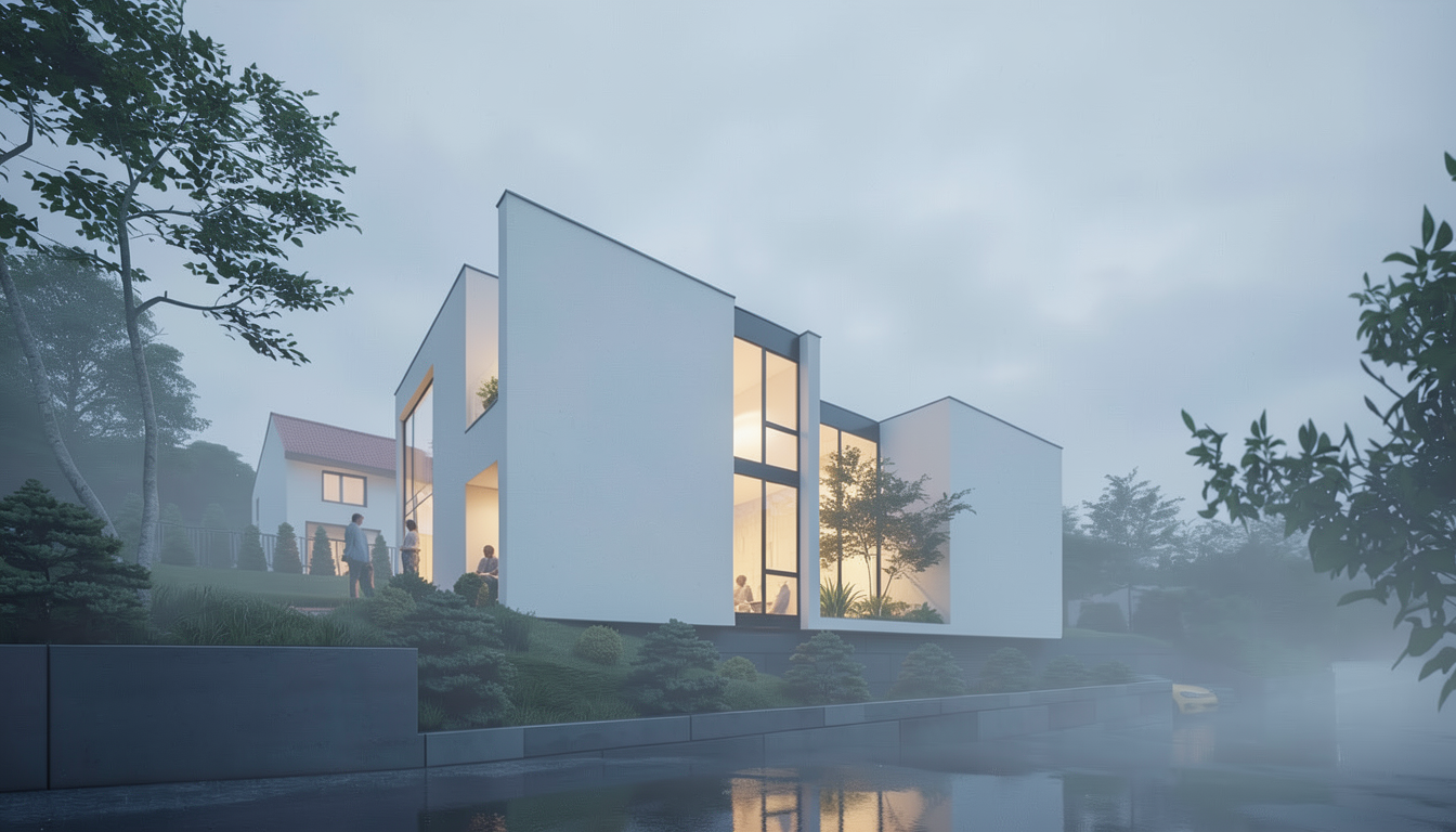 important preserve the existing geometry and the existing context exactly as provided do not modify alter reinterpret add remove scale or reshape any geometry do not change the site surroundings street layout neighboring buildings vegetation or context elements do not modify geometry scale proportions buildings road layout sidewalks or surrounding context in any way do not change text photorealistic architectural rendering clean and balanced contrast calm cinematic mood style contemporary european residential architecture minimalist premium understated include people seating and standing inside do not alter the church color soft overcast evening atmosphere diffused cold natural daylight with subtle blue grey tones cinematic architectural mood warm interior lighting 3000k glowing from inside creating strong contrast between cool exterior and warm interior large glass surfaces with realistic reflections soft mirror effect subtle environmental reflections of sky and surroundings gentle fog diffusion in background wet pavement with smooth reflective surface soft light bounce and blurred reflections high dynamic range lighting realistic global illumination soft shadows calm and minimalist nordic mood photorealistic architectural visualization balanced exposure no harsh highlights
