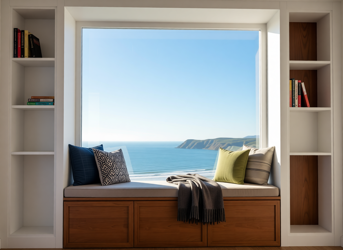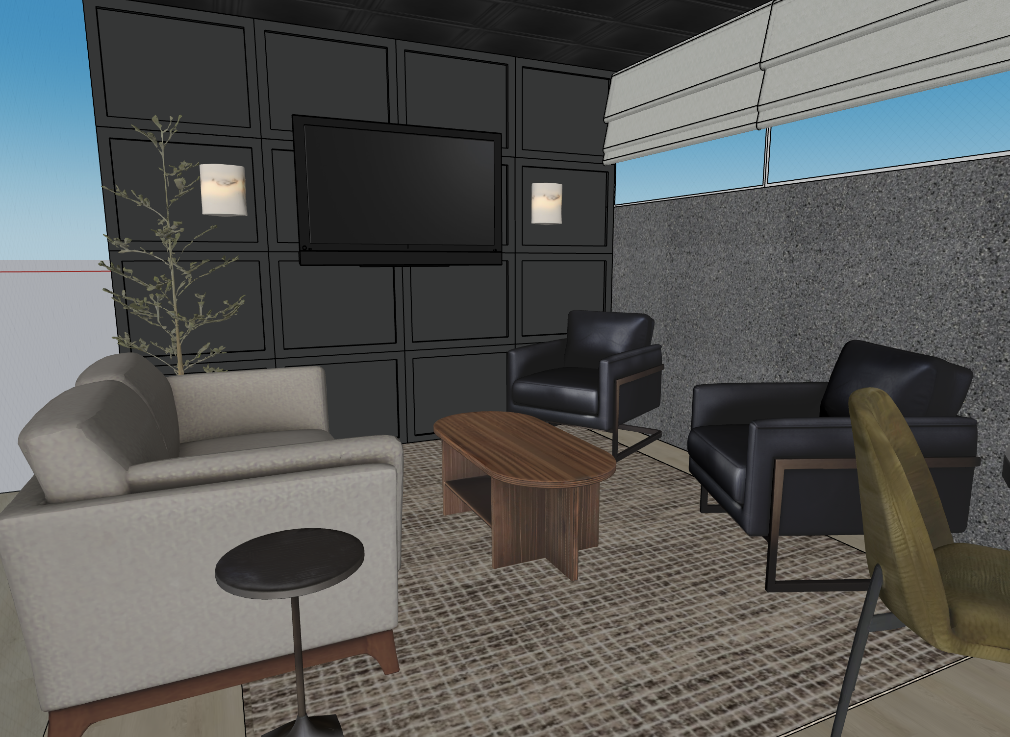 create a glass enclosure wall behind the sofa with a view of an office behind