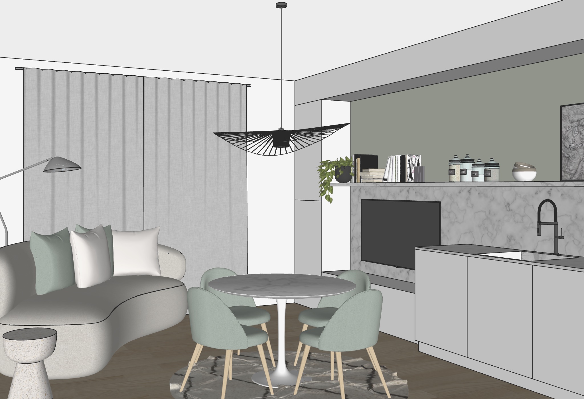 add recessed spotlights into the false ceiling and let some natural light filter through the curtain the ceiling is painted white the sofa has boucle fabric