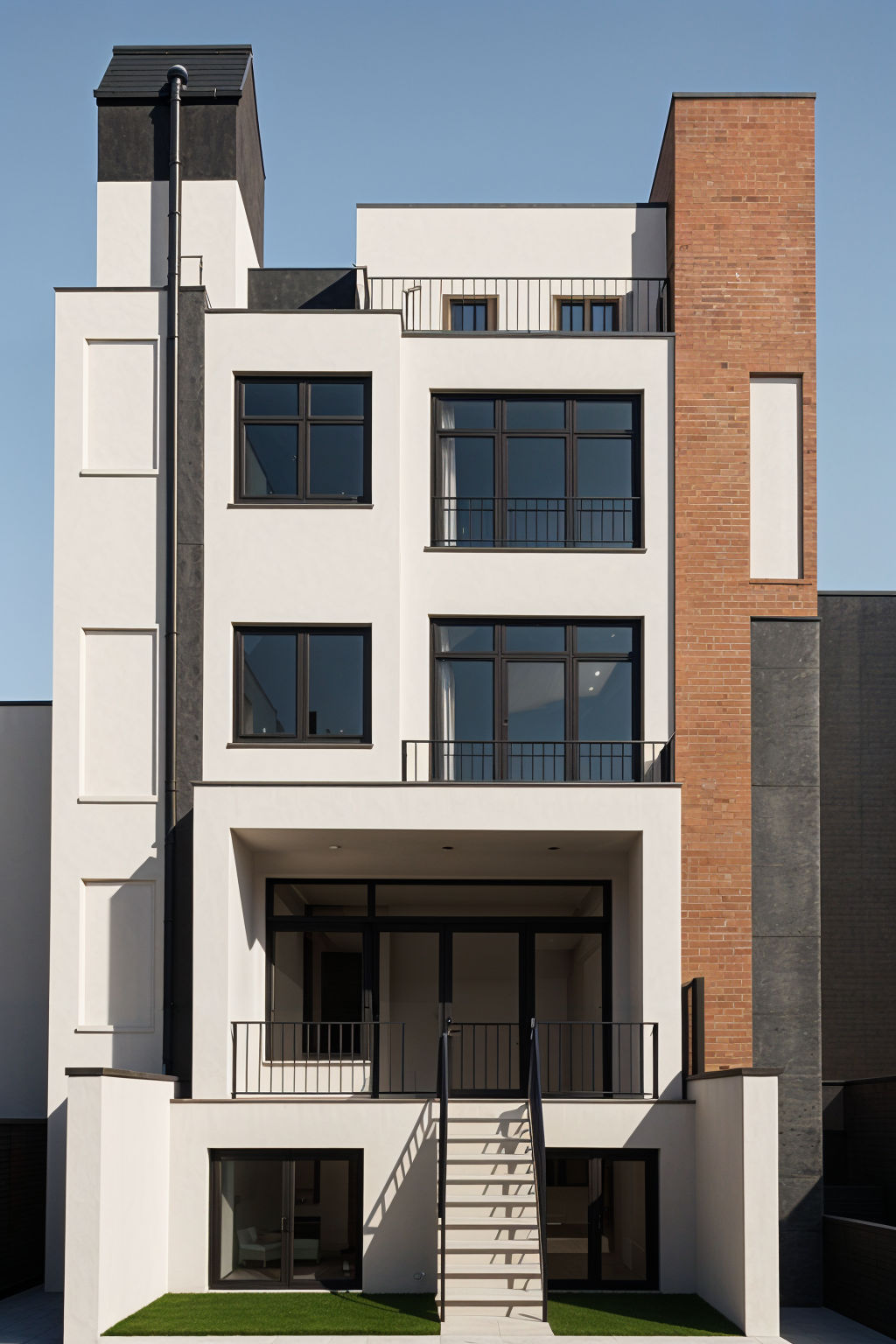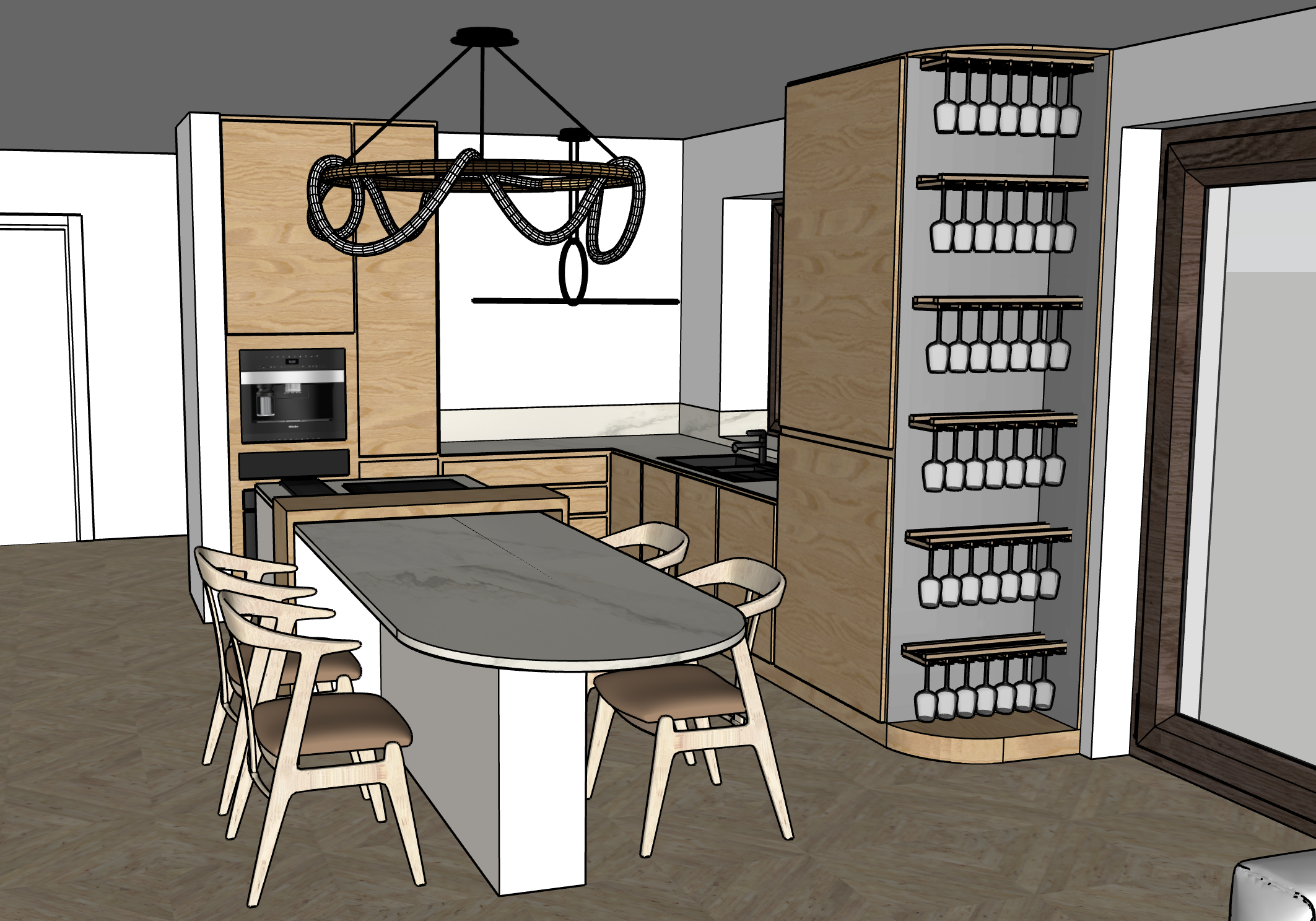 modern kitchen interior with a sleek and elegant design featuring light oak wood cabinetry and a neutral stone countertop on the right side there is a wine glass dispmay lit with leds and mirrors on both sides the kitchen island has a smooth rounded edge and a marble surface the flooring is a warm herringbone patterned wood above a black metal chandelier adds an industrial touch the atmosphere is cozy yet sophisticated with a focus on natural textures and a balanced color palette of soft beiges greys and earthy browns large windows with dark frames let in ample natural light creating a bright and inviting space