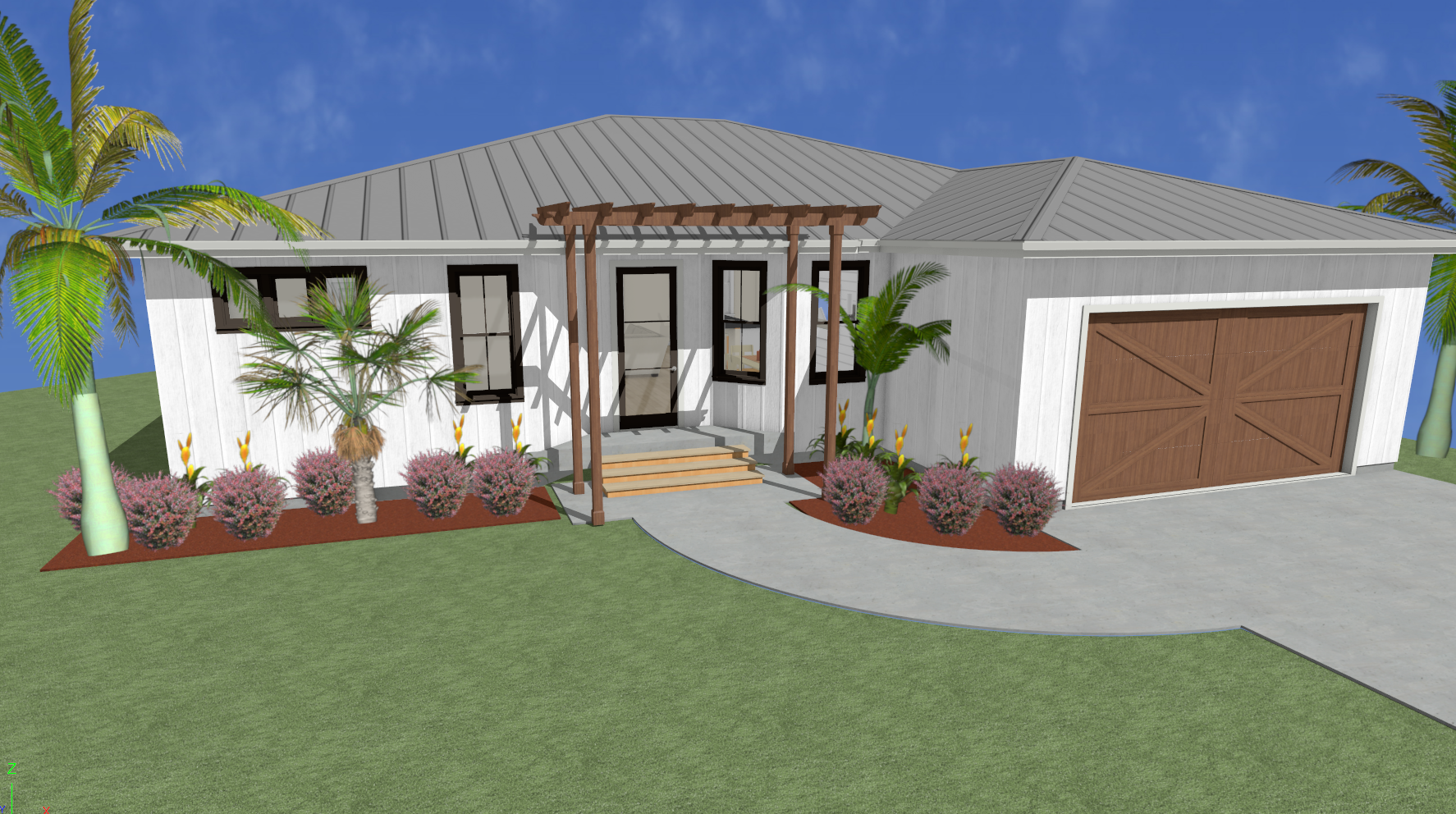 create a photo realistic image of this home with a tropical landscape and florida friendly plants be sure to keep all geometric shapes and the style of the home it is a modern farmhouse