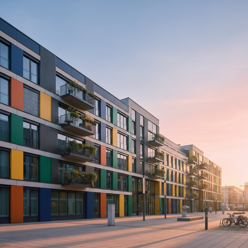 spring cosy sunny day clouds in the sky few white petals on the trees keep the colours of the building