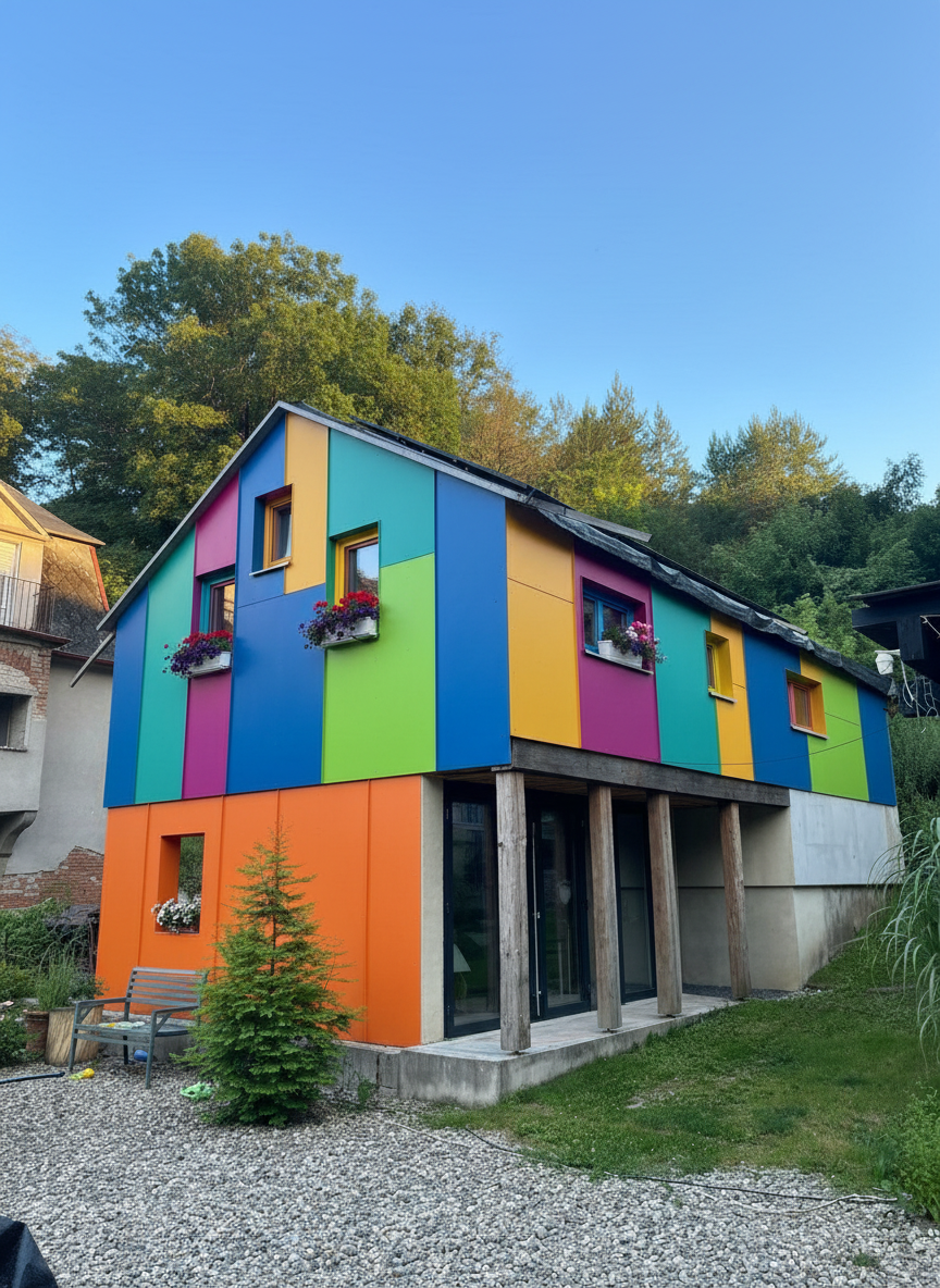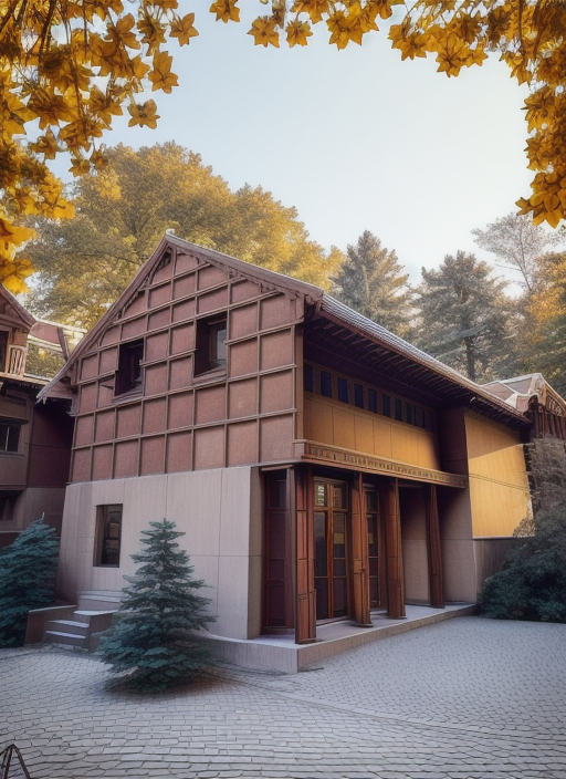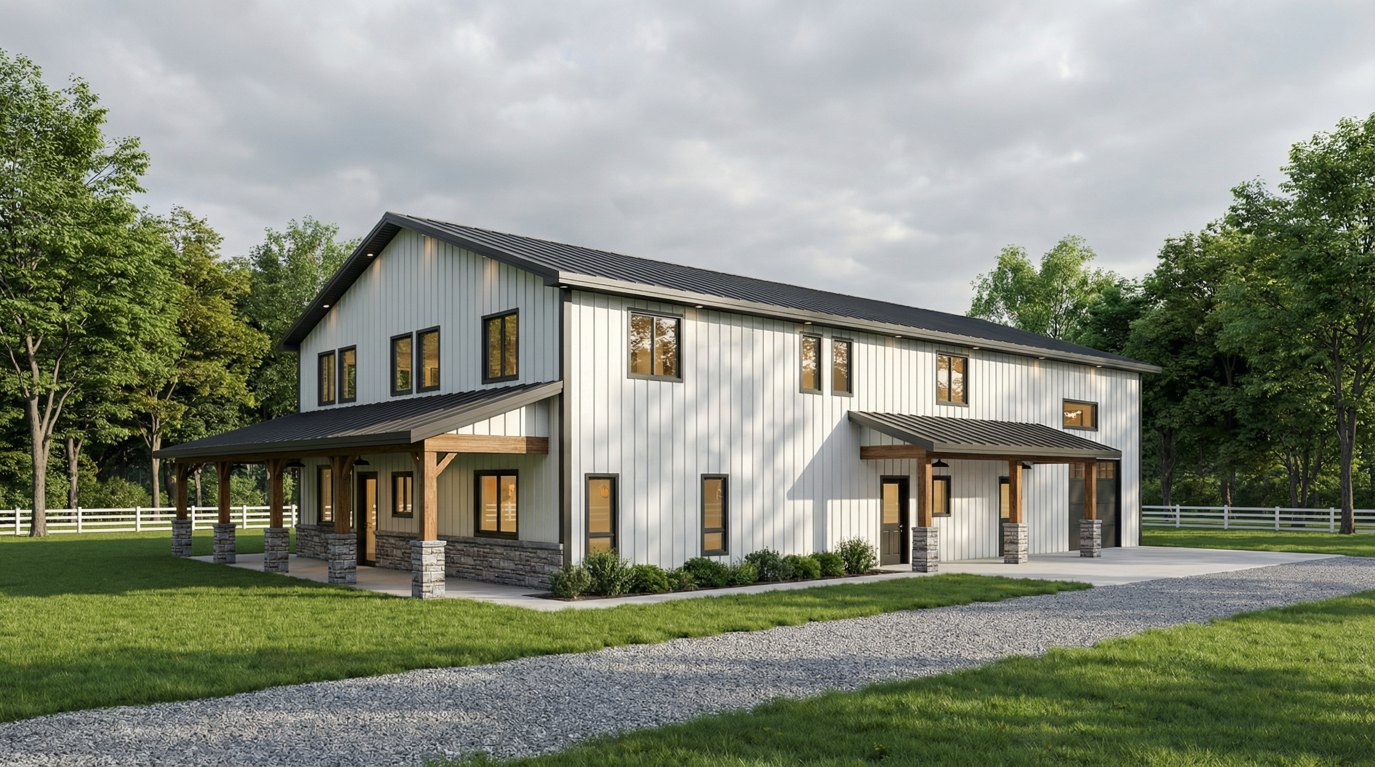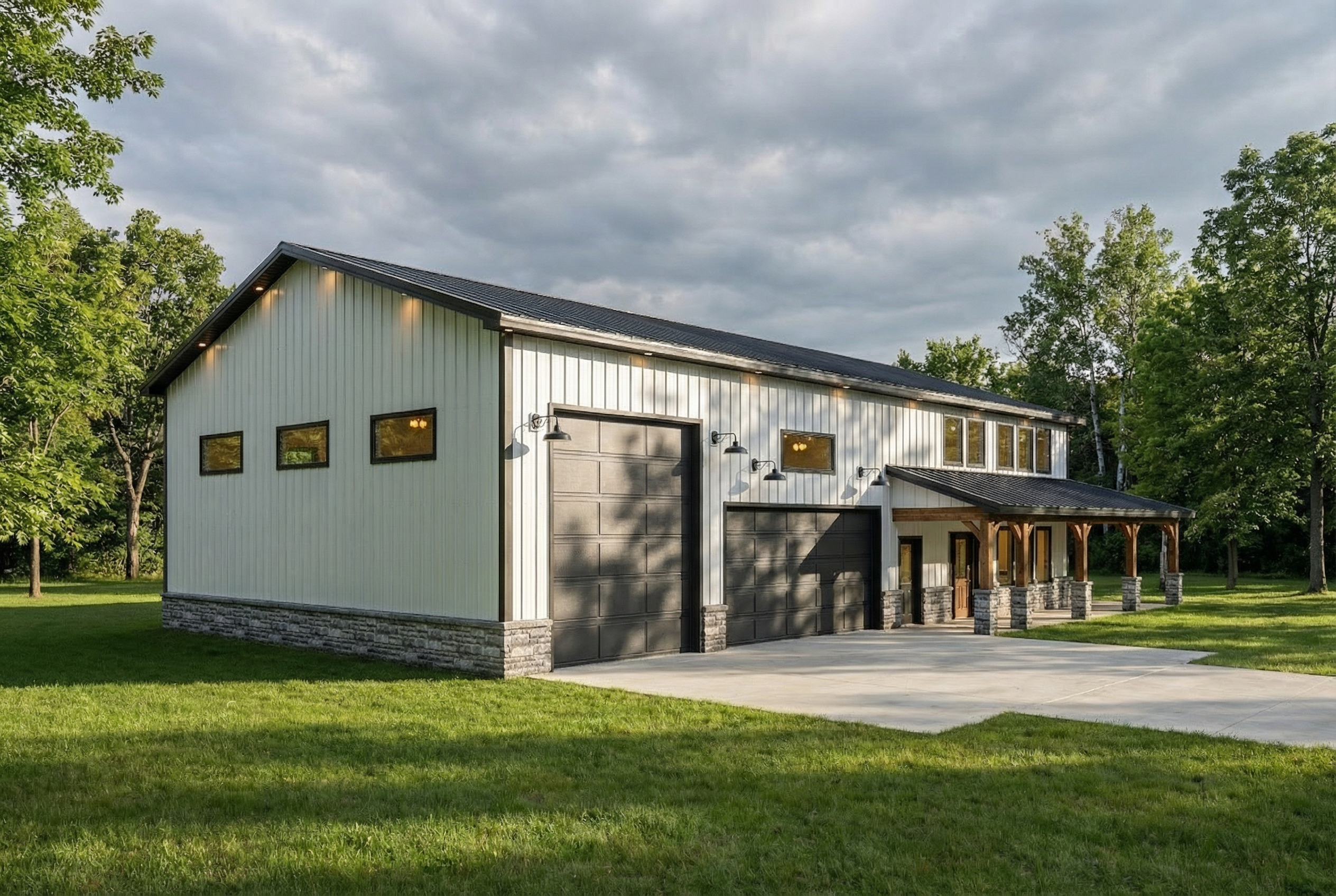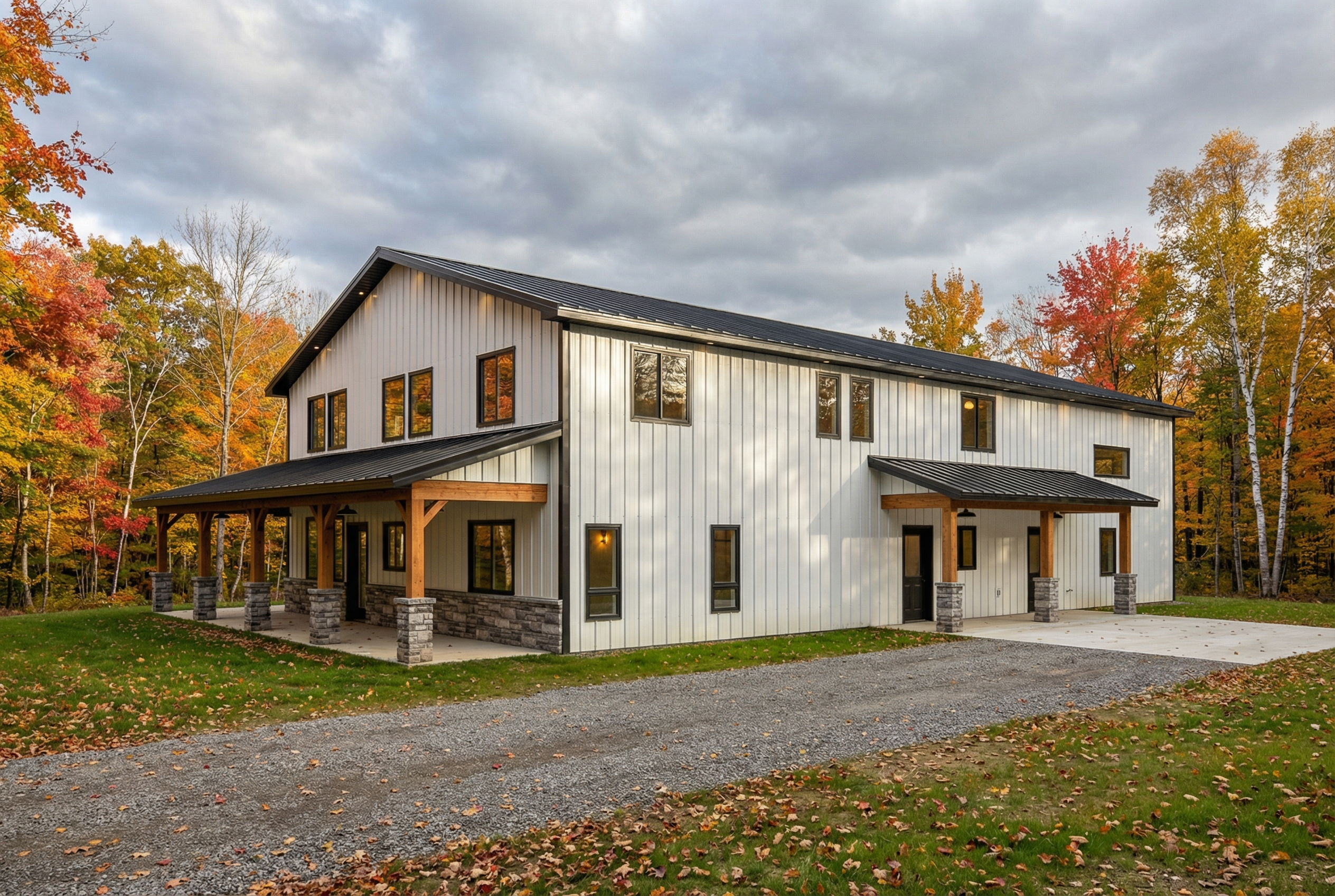 a modern house retain the exact structure metal roof colors and window arrangement rooflines siding foundation height and proportions exactly as shown in the reference image integrate into the terrain there are just a few trees mixed hardwoods that are mostly on the sides of the image add cooler afternoon sunlight subtle dappled highlights across the siding and grass create ultra realistic lighting crisp shadows detailed textures in the siding and glass reflections and an overcast sky show only a few lights visible inside render in hyper realistic architectural visualization quality 8k resolution add a driveway tying into the concrete garage door apron make it the fall season add realistic landscape