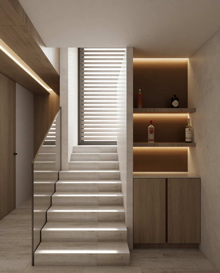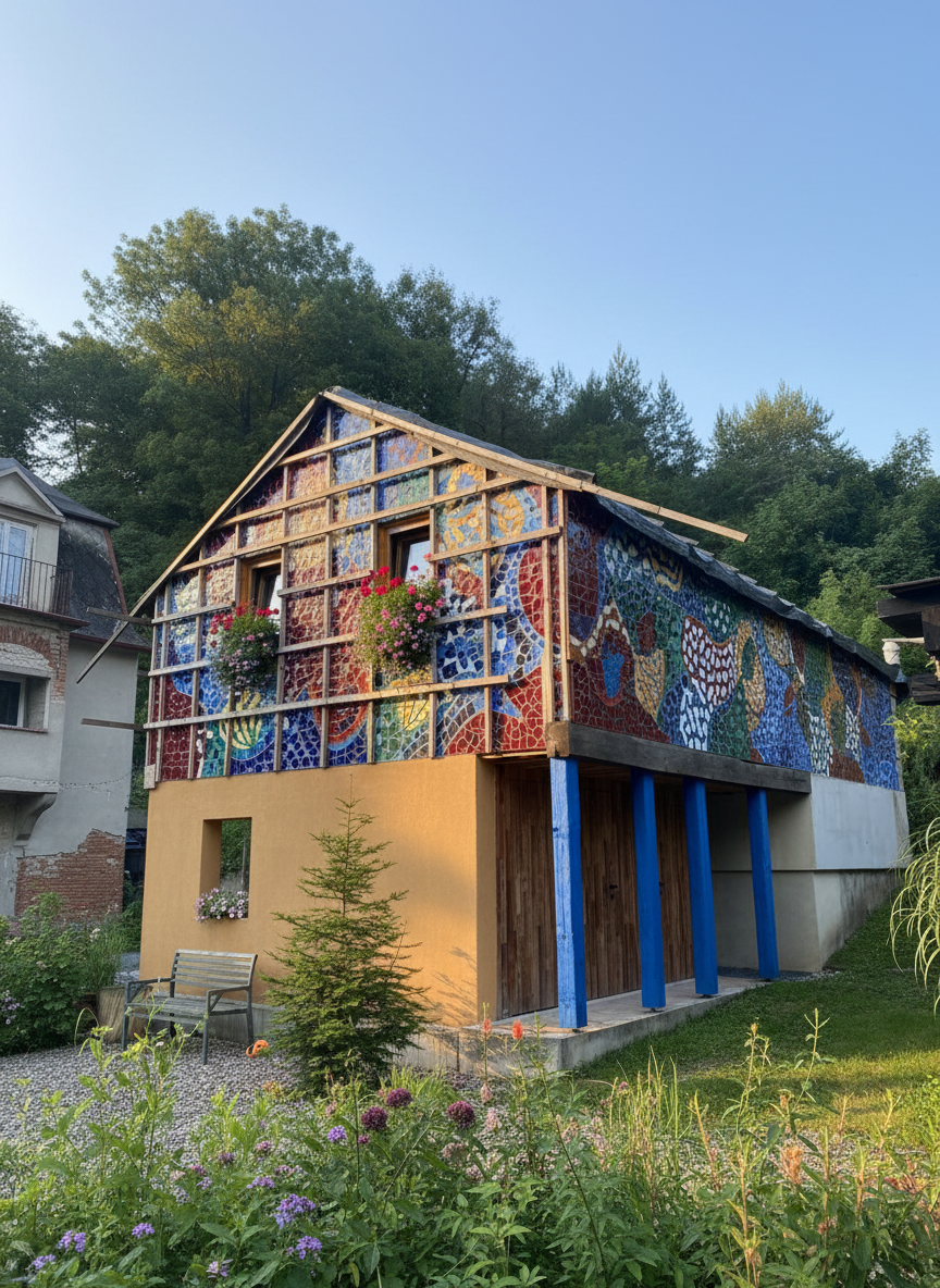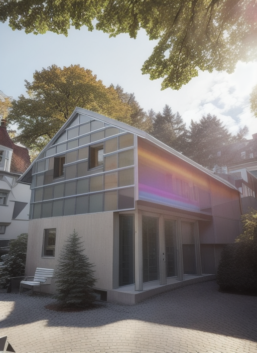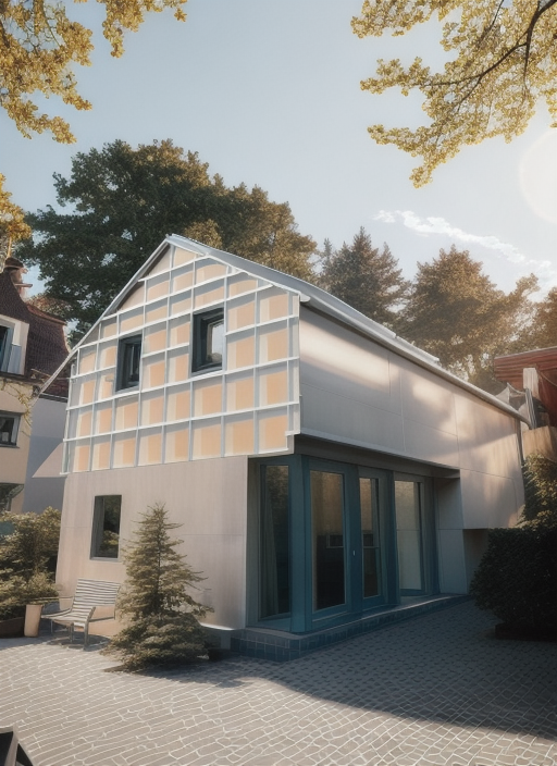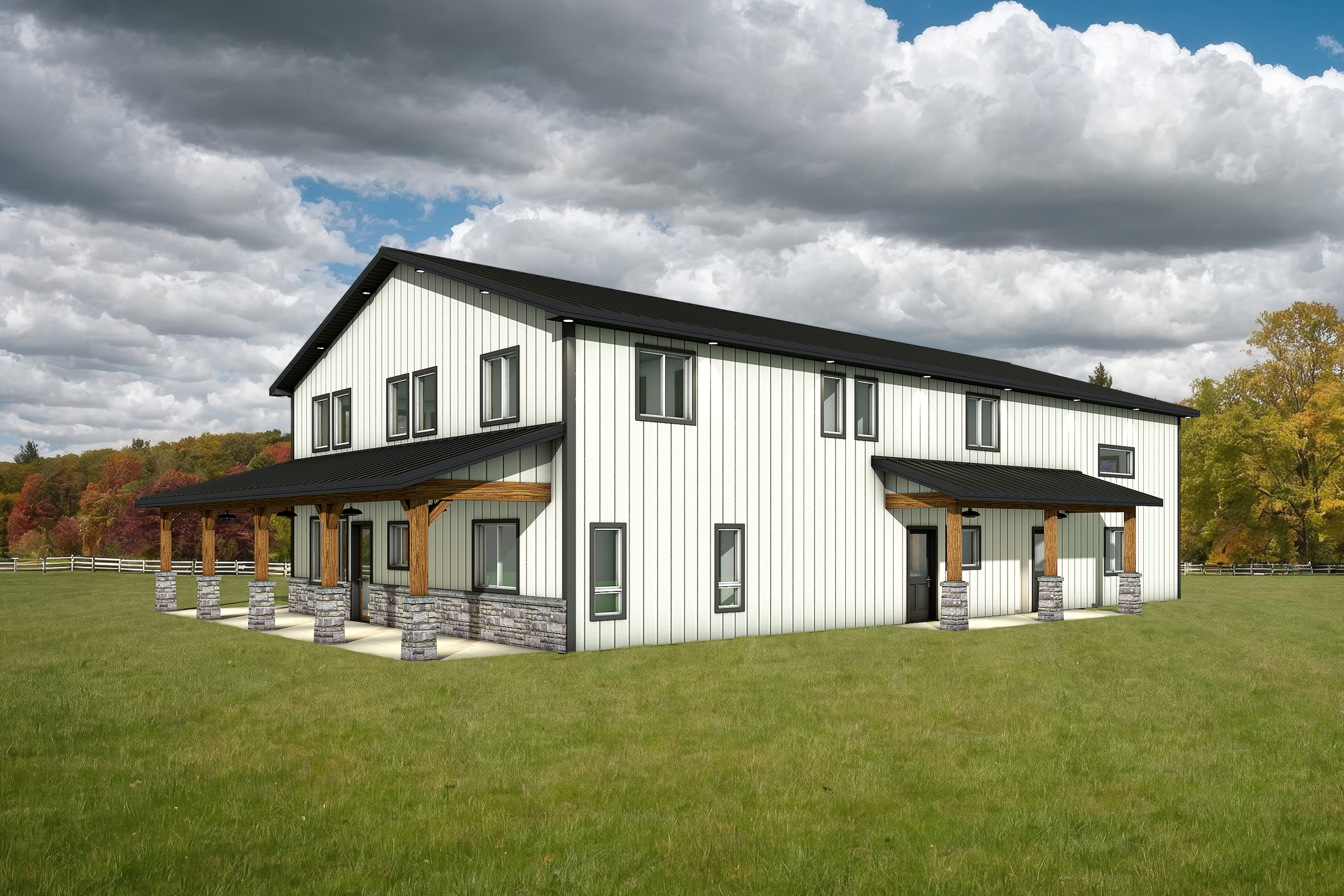 a modern house retain the exact structure metal roof colors and window arrangement rooflines siding foundation height and proportions exactly as shown in the reference image integrate into the terrain there are just a few trees mixed hardwoods that are mostly on the sides of the image add cooler afternoon sunlight subtle dappled highlights across the siding and grass create ultra realistic lighting crisp shadows detailed textures in the siding and glass reflections and an overcast sky show only a few lights visible inside render in hyper realistic architectural visualization quality 8k resolution add a driveway tying into the concrete garage door apron make it the fall season add realistic landscape