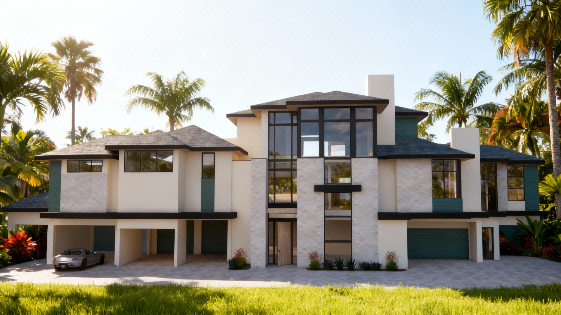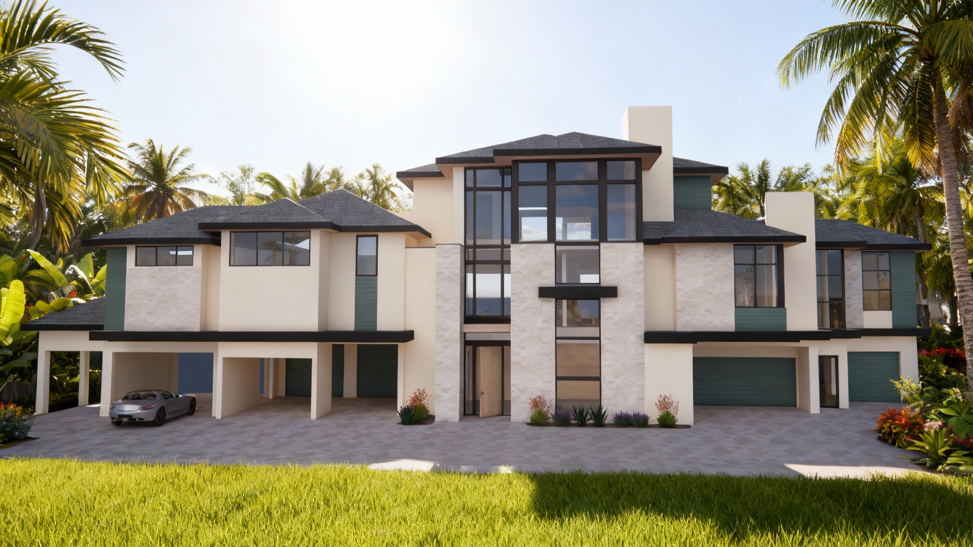 zaha hadid exterior shot generate a photorealistic architectural visualization based on the attached elevation drawing of a modern residential building use the exact geometry and proportions from the elevation apply realistic textures such as light gray plaster dark graphite panels and reflective glass for the windows place the building in a natural urban environment with realistic lighting shadows sky and context including pavement greenery and subtle background buildings the perspective should be front facing at human eye level and the final result should look like a professional real estate presentation image architecture