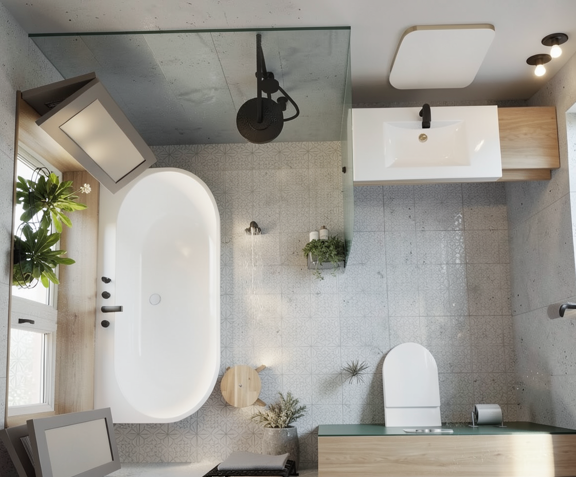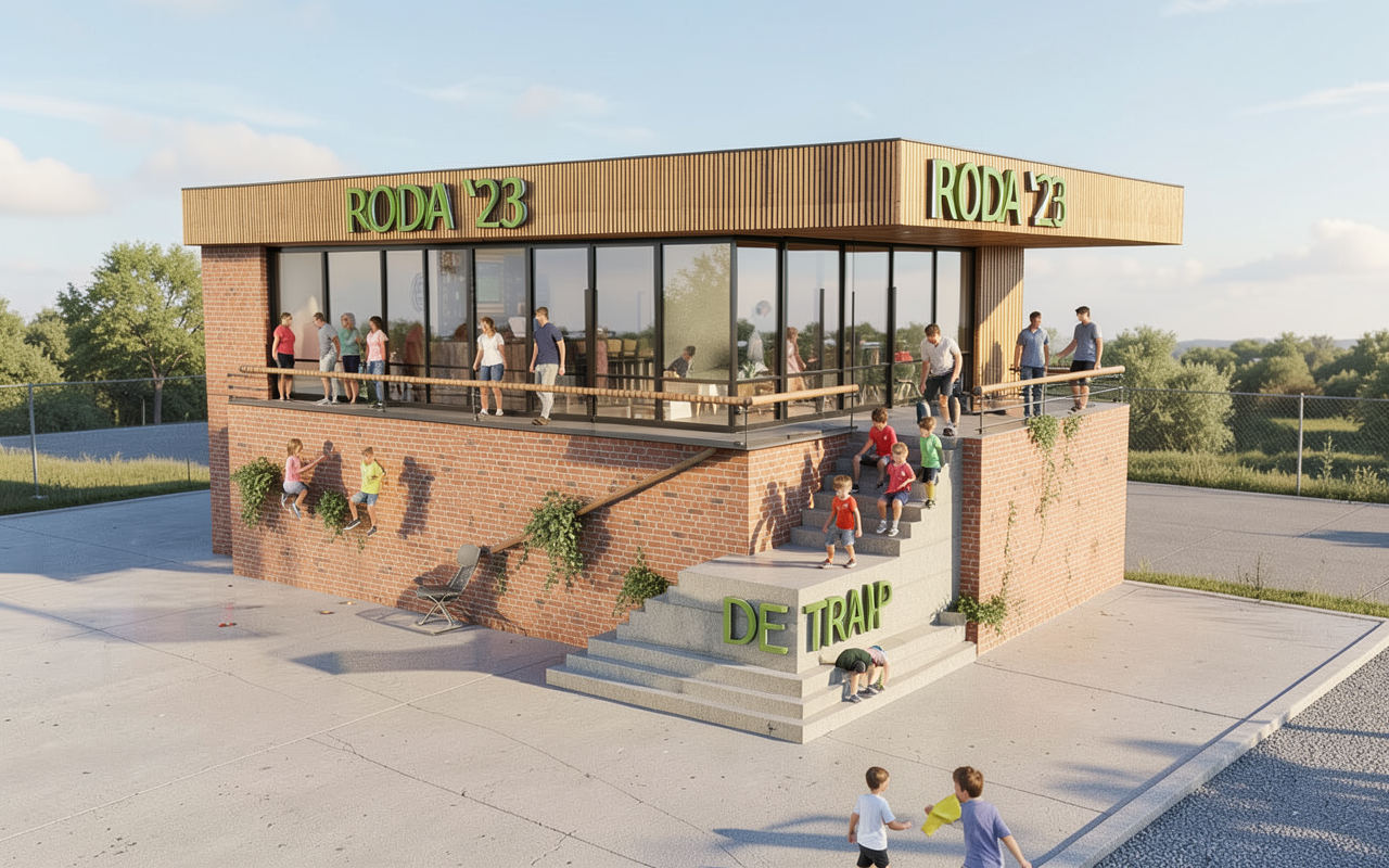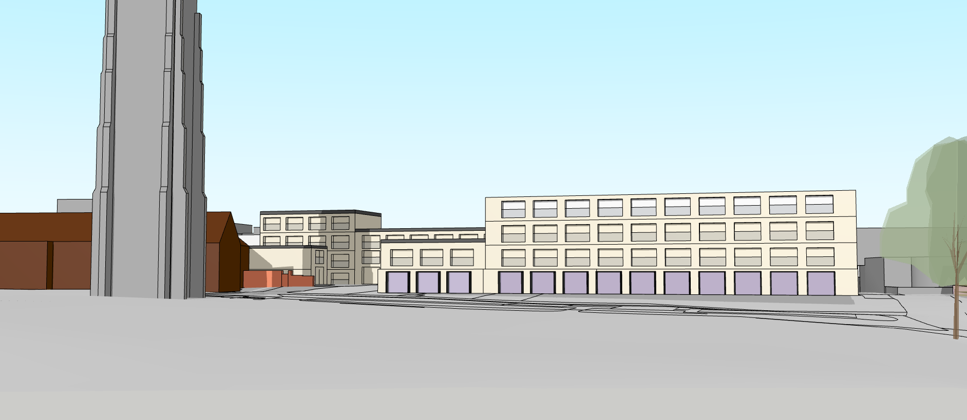 render a natural stone modern retail development with shop fronts looking out onto a manicured park with lawns landscaped borders to the left of the retail development is a stone 13th century bell tower and the orange building at the left of the image is a church both the church and the bell tower are built from a local beige stone and are gothic in style