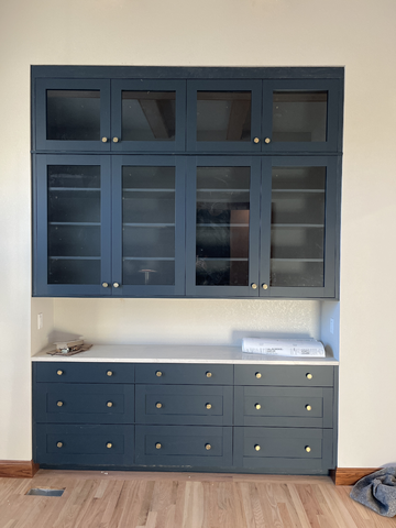 do not change the cabinets in any way preserve the exact cabinet colors materials finishes dimensions door and drawer styles hardware spacing alignment and all geometry exactly as shown do not alter the countertop shape backsplash appliances flooring lighting fixtures or wall structure only remove the construction materials clutter and mess from the scene clean the room and make it look finished and staged add a few simple tasteful home accessories appropriate for the style of the space but do not add or remove any furniture windows or architectural elements maintain the original lighting direction and realism enhance clarity and polish the photo while keeping the cabinetry and room design completely unchanged do not alter the lighting to keep the cabinet colors as they are in the image stage for glassware and bookclub