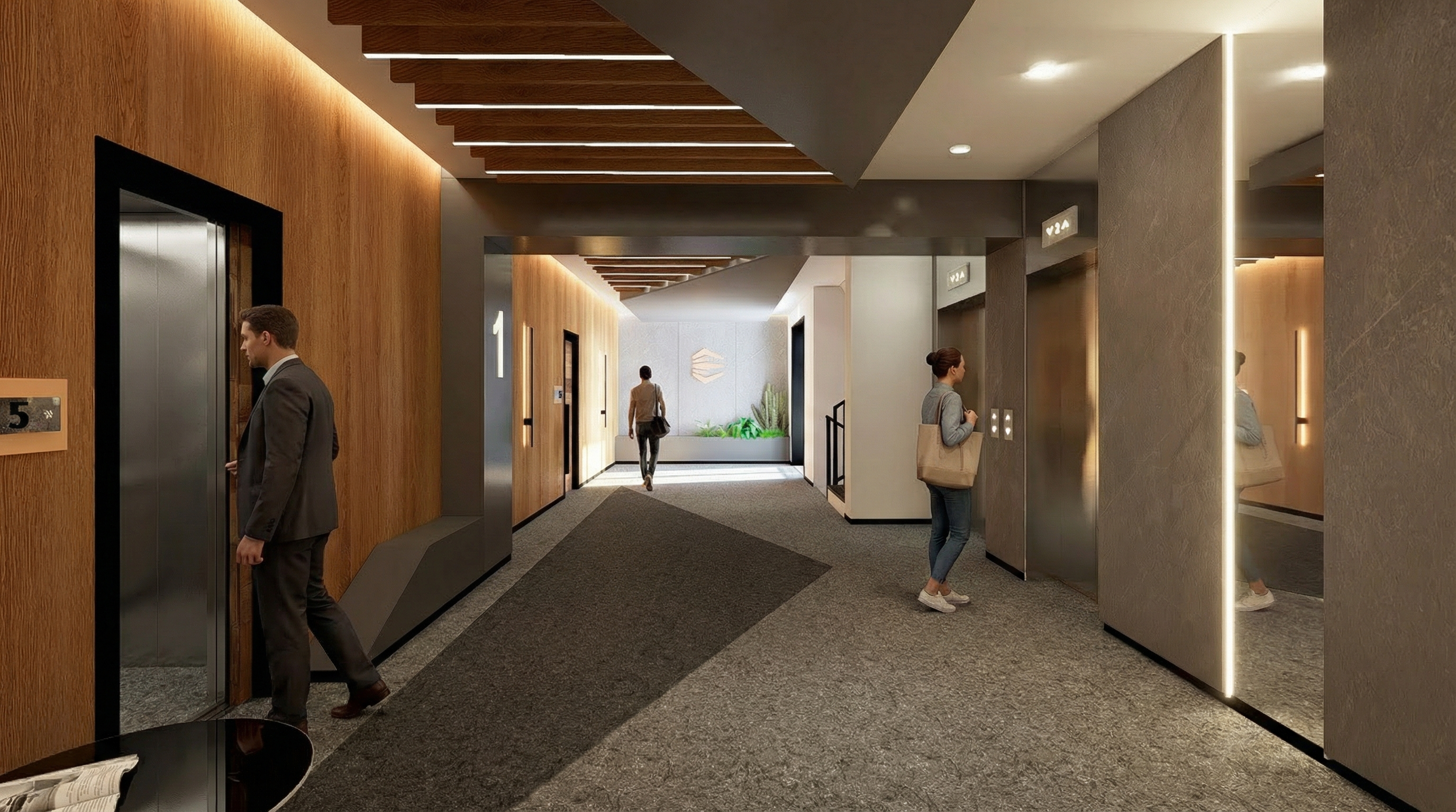 change the cabinet into a american walnut veneer with the countertop and backsplash in white corian the surface must appear seamless clean and subtly reflective wall cabinets in medium dark gray matte lacquer finished should be smooth non reflective include indirect lighting under cabinet led strips the lighting should create a soft ambient glow the appliances of the refrigerador microwave and dishwasher must be represented in stainless steel with realistic reflections and finishes the cooktop is a 4 burner electric cooktop the lightning should be warm and balances the floor change into a laminate dark walnut veneer flooring and white plaster finish on walls and ceiling add the kitchen decorating like spice containers whit glass jars with wooden lids replacing a high arc stainless steel single handle kitchen faucet change the red material of the shelves into a american walnut veneer add under indirect led strips replacing the yellow material into american walnut veneer change the yellow material into american walnut veneer