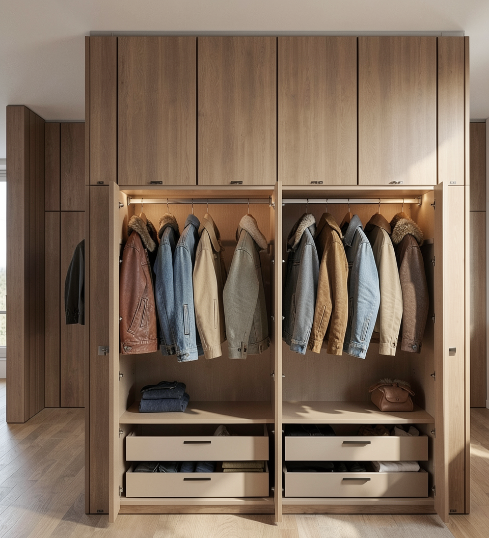 do not change the original details and do not change the materials and finishes shown wood on the outside off white leather on the inside remove handless and little notes on the doors add jackets and coats inside