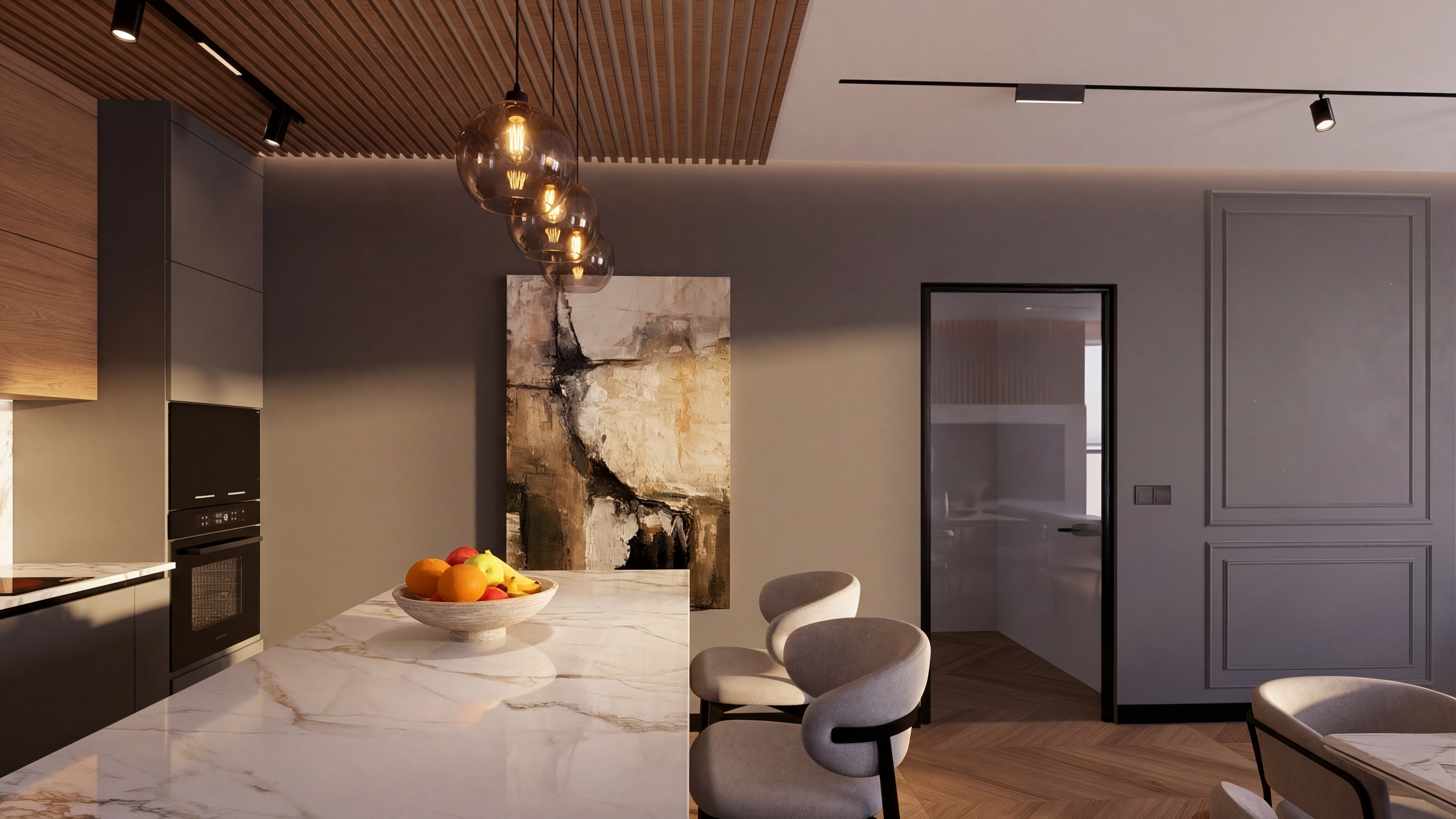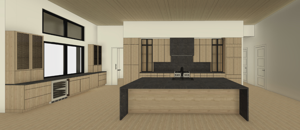 realistic architectural interior rendering in natural daylight preserve all existing architectural elements exactly as shown do not add remove or reposition any structural components cabinetry layout appliances or fixtures unless explicitly stated below countertops two countertop sections only one to the left of the oven and one on the island the hood is also in the same material no other surfaces added material charcoal marble with very fine thin naturally blending veins soft and organic not bold or graphic no thick or marker like veining cabinetry all light wood cabinetry and flooring shown should render as light neutral oak neutral not warm natural grain not yellow or orange all exterior facing black cabinets must render in matte black no sheen or gloss left window cabinets mesh door detail the tall flanking cabinets on either side of the windows on the left wall must have door fronts featuring a woven metal mesh inset panel a fine tight diamond pattern wire mesh with a dark bronze aged brass tone set within a flat oak frame the mesh has visible depth and texture it is not a printed pattern or perforated sheet but a three dimensional interlocked woven wire hardware no small round brass knobs the cabinet body frame color and proportions must remain exactly as shown in the base rendering only the door insert material changes to this mesh detail styling details interior of left side cabinets add stacked plates and minimal decorative objects visible through the mesh island surface one small potted plant and one fruit bowl placed naturally no pendant lighting added atmosphere realistic natural daylight windows must show lush green trees and a clear blue sky no artificial lighting introduced do not add any furniture fixtures d cor or architectural elements beyond what is described above key addition explained the phrase three dimensional interlocked woven wire not a printed pattern or perforated sheet one change only the tall cabinet doors on the far left wall must be updated to feature a tight dense woven metal mesh insert the pattern should read like an interlocked diagonal weave similar in density to chain link or barbed wire mesh where individual wire crossings are clearly visible and tightly packed with very little negative space between them the mesh should appear dark bronze to near black in tone receding slightly behind the oak frame it is a three dimensional woven material with visible wire depth not a screen not a perforated sheet not an open grid the oak cabinet frame proportions brass hardware and all surrounding elements remain exactly as shown do not alter any other element in the image please follow the rendering the cabinets around the hood should be wood and the glass cabinets needs to follow the image i attached