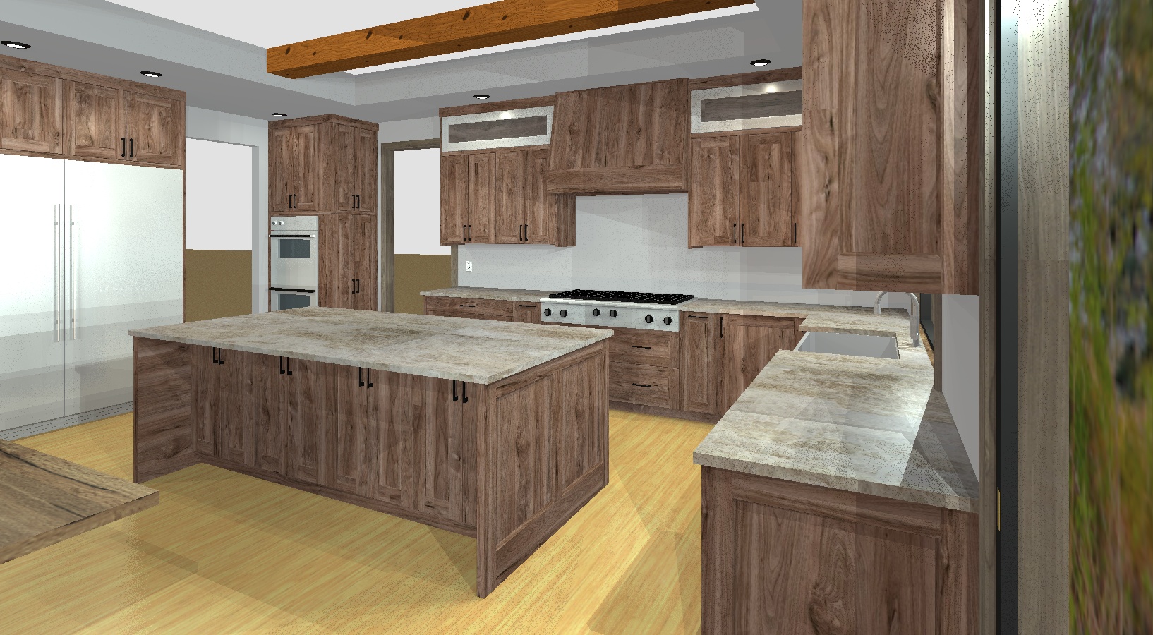 render a beautiful modern kitchen with rich walnut wood cabinetry and a taj mahal countertop the kitchen features stainless steel appliances including a double oven and a large refrigerator the wooden beams on the ceiling add rustic charm while recessed lighting enhances the contemporary feel the flooring should be light oak for a warm inviting atmosphere the walls are painted a soft neutral taupe to complement the cabinetry and large windows allow natural light to stream in creating a bright and airy environment
