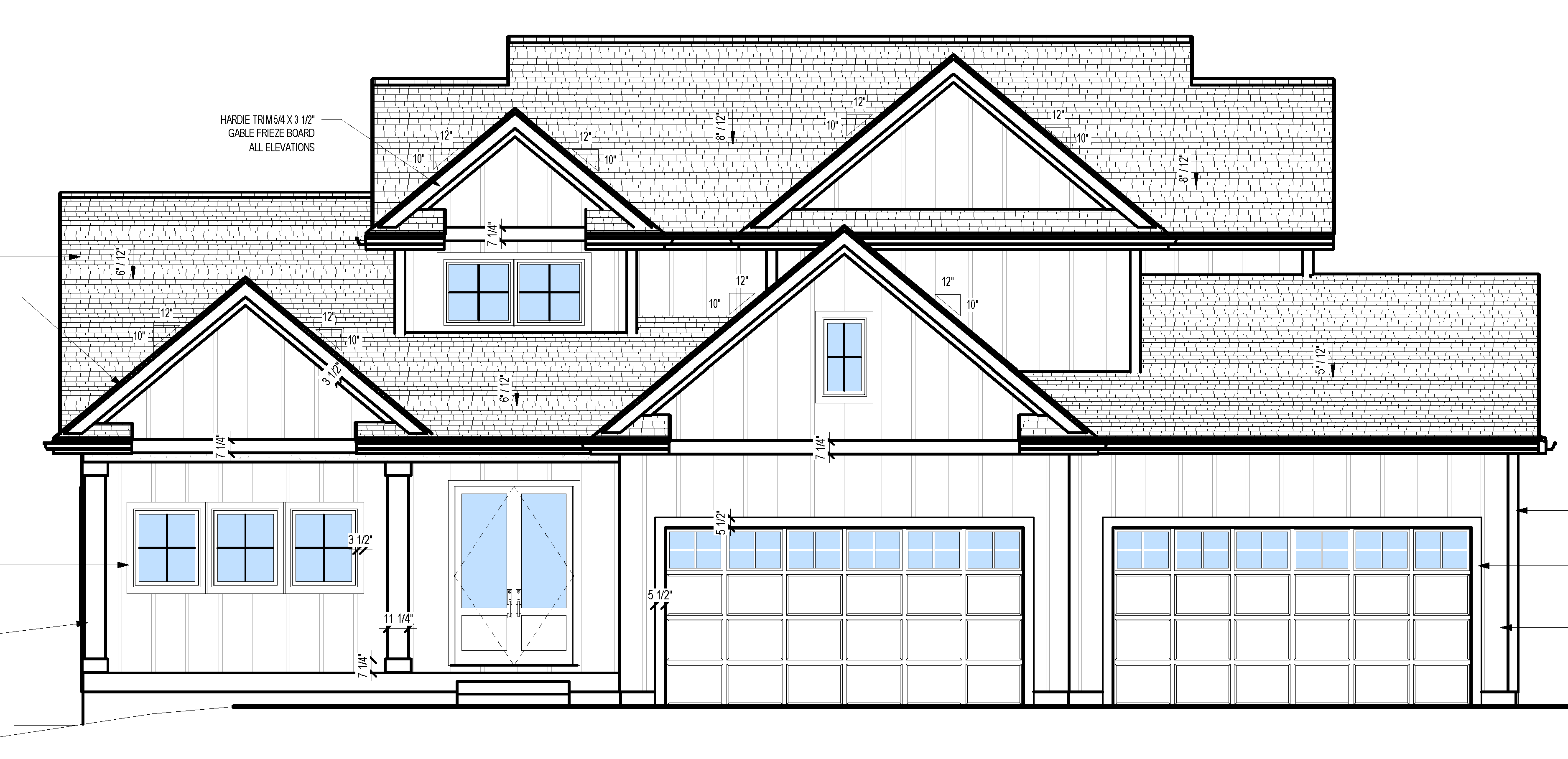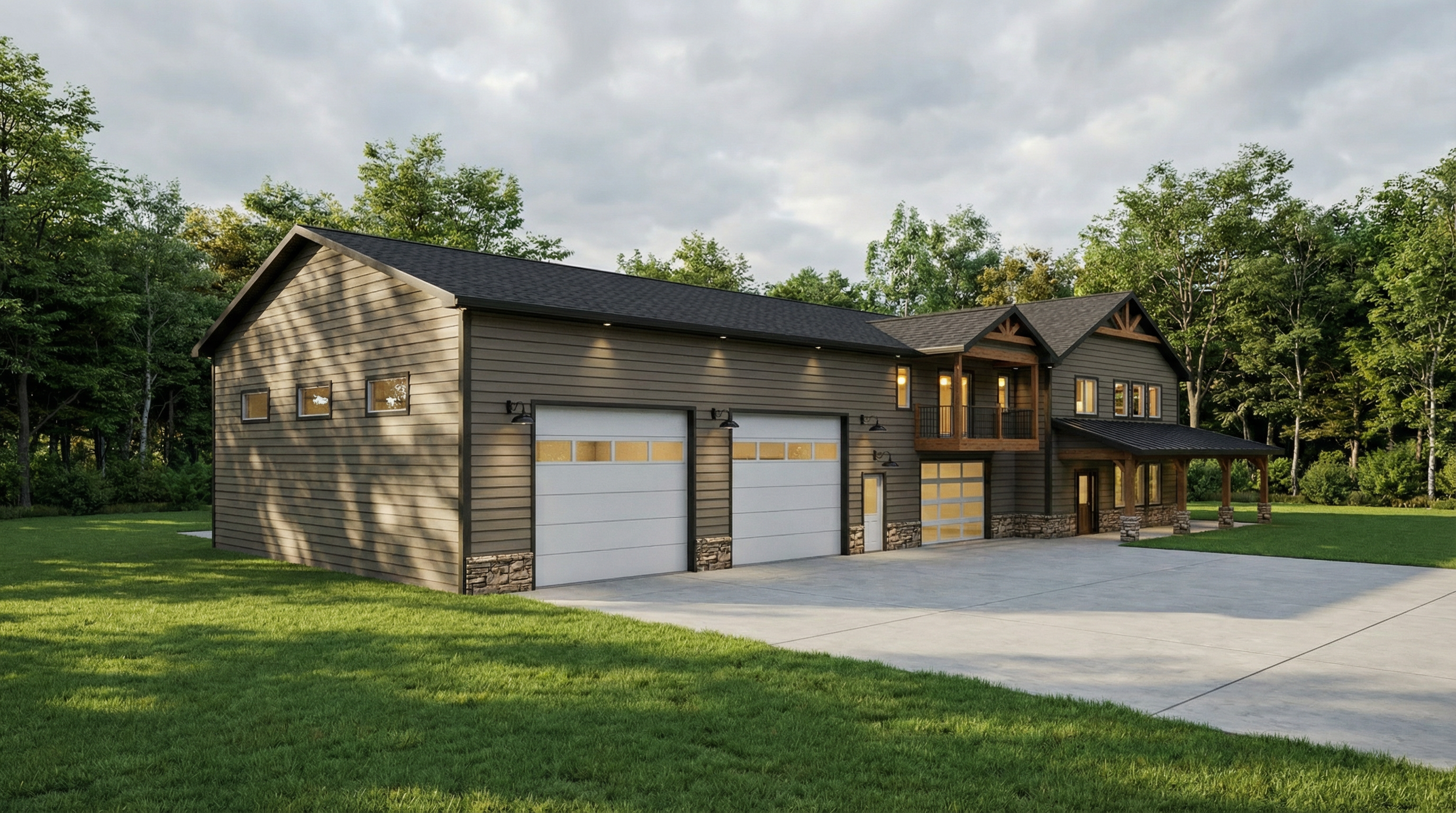 black roof black garage doors black windows black front door off white fascia and soffit off white siding clear stained cedar columns off white gutters and and down spouts add troy bushnell in driveway