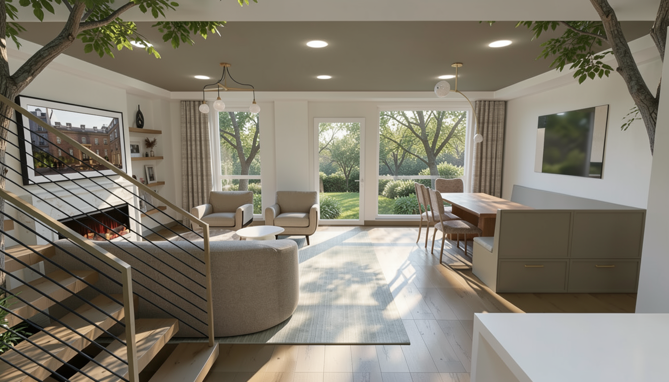 add people in the wheelchairs who are watching tv add a person of the left who is walking past them keep the materials like in the render the panel is textile add typical office panel ceiling and general lighting general lighting should be across the room make the led stripon the right of the panel more diffuse