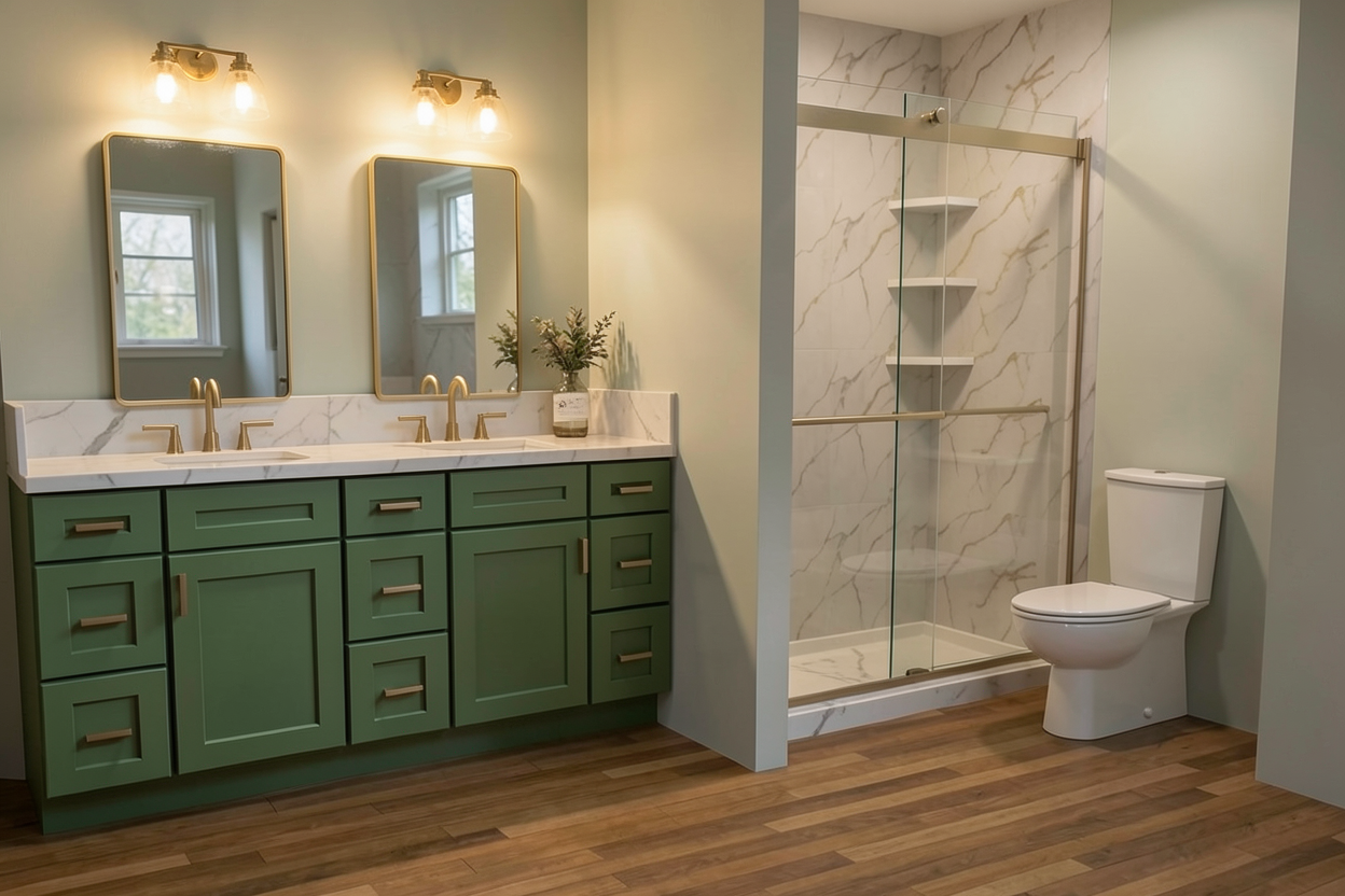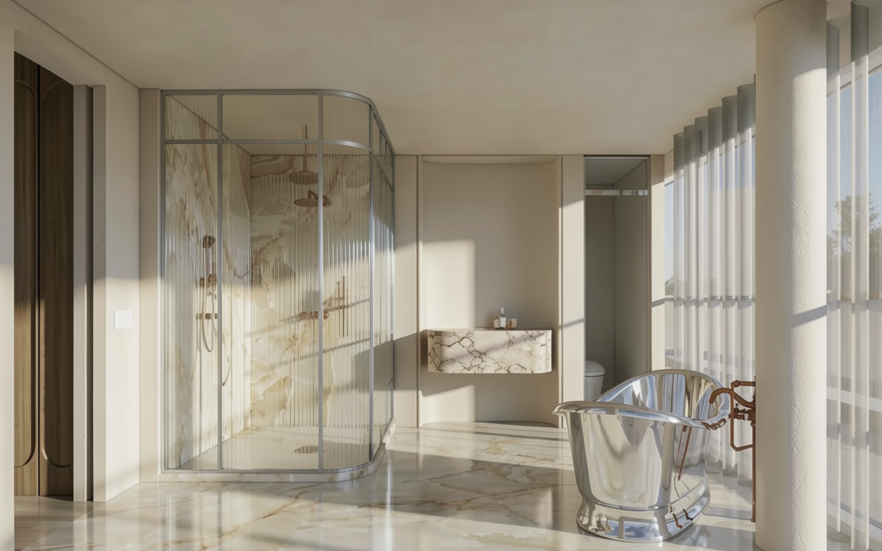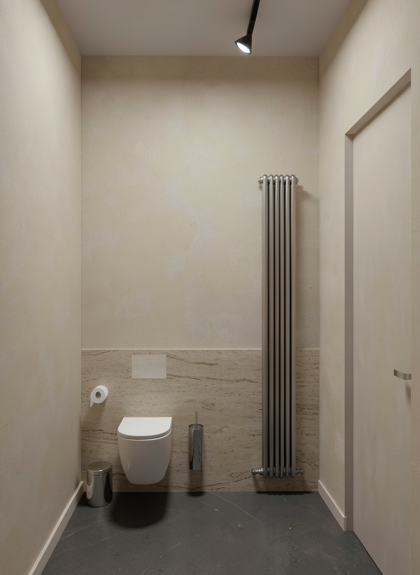 create realistic balanced bathroom lighting while strictly preserving the original geometry composition and camera angle do not modify add remove or reshape any architectural elements or objects the bathroom walls are finished with natural delicate beige plaster lighting should gently reveal subtle surface texture soft tonal variations and a matte mineral character with no harsh shadows or exaggerated contrast the floor is finished with dark natural stone in an irregular pattern strictly preserve the original floor pattern and layout do not simplify regularize repeat or alter the irregular stone arrangement maintain the exact stone sizes shapes joints and pattern distribution the floor must appear matte and non reflective with low gloss soft light absorption and no visible shine polish or wet surface effects the surface behind the toilet is made of natural stone rendered with physically accurate properties realistic material weight fine surface irregularities subdued reflections and natural color depth use soft neutral artificial lighting appropriate for a bathroom environment light should be evenly distributed calm and functional avoiding dramatic contrast glare or cinematic lighting effects the wall mounted radiator is charleston by zehnder finished in stainless steel the material should be rendered with realistic brushed metal properties subtle reflections correct roughness soft light response and no excessive shine or mirror like reflections enhance global illumination soft shadows ambient occlusion and natural color balance the final result should resemble a high end calm photorealistic bathroom interior with a refined natural atmosphere