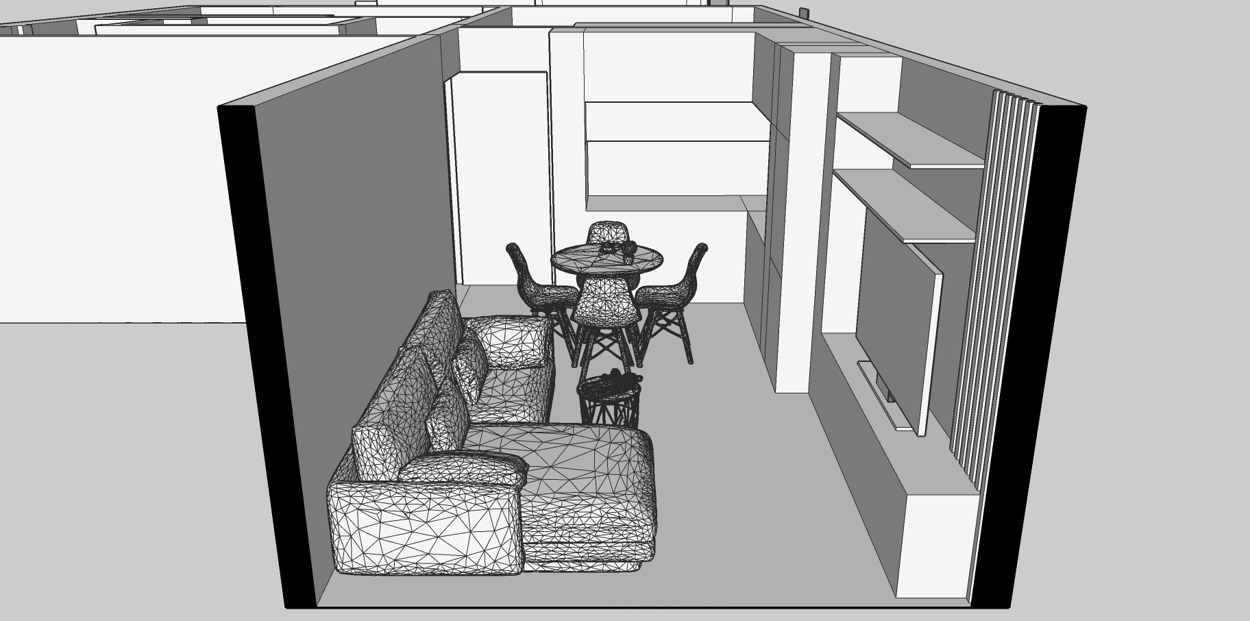 render with hihg complexity keep the size and placement from the original image and use textures nd colour scheme from the reference image add wall decor and fill shelves with books and plants