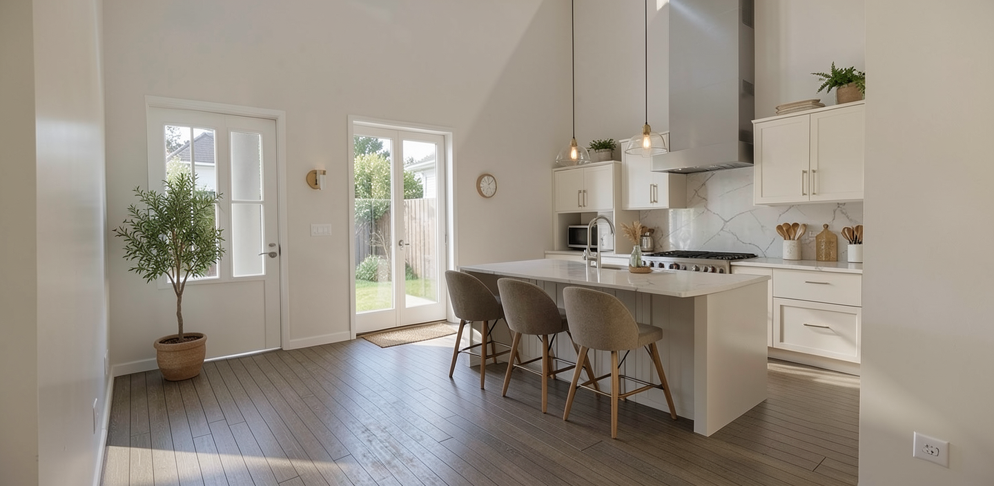 coastal replace background sky with a sunny blue sky with puffy clouds add florida lawn and landscaping on both sides of the driveway with queen palms flowers and crepe myrtle trees