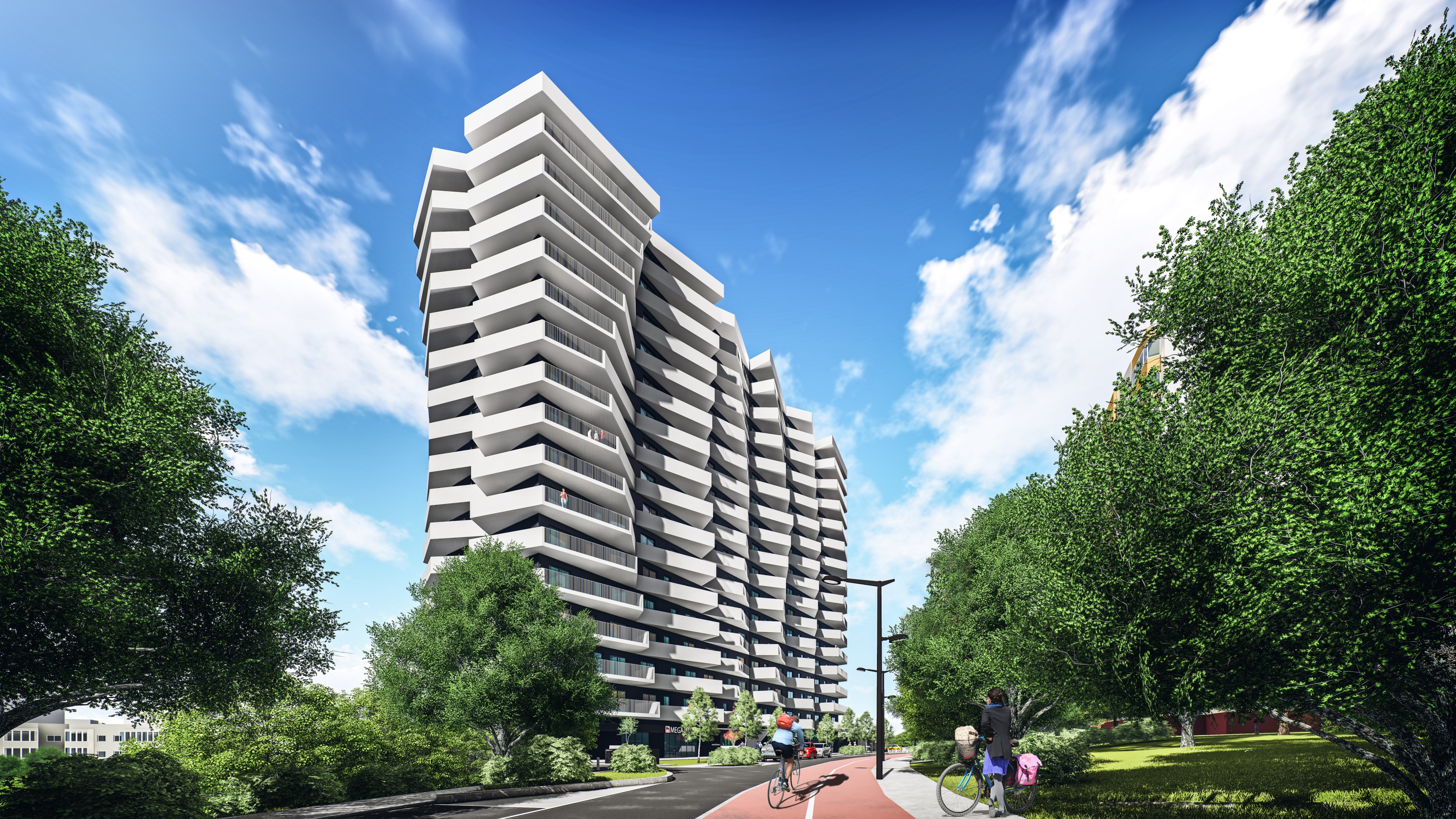 important preserve the existing geometry and the existing context exactly as provided preserve the existing windows do not add new windows do not modify alter reinterpret add remove scale or reshape any geometry do not change the site surroundings street layout neighboring buildings vegetation or context elements do not modify geometry scale proportions buildings road layout sidewalks or surrounding context in any way do not modify text soft noon atmosphere diffused neutral natural daylight with subtle cold tones cinematic architectural mood warm interior lighting 4000k glowing from inside creating slight contrast between cool exterior and warmish interior large glass surfaces with realistic reflections soft mirror effect environmental reflections of sky and surroundings important do not add new windows