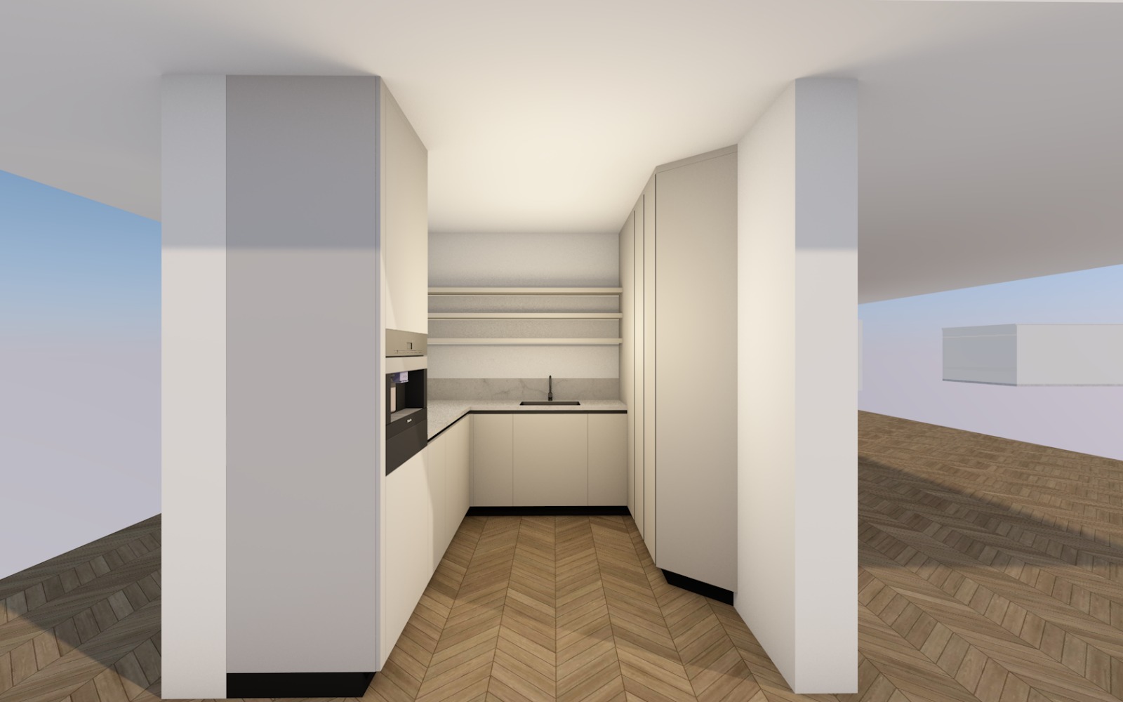 modern interior kitchen with mont in coffee mashine led ligts everywhere soft colors no wood