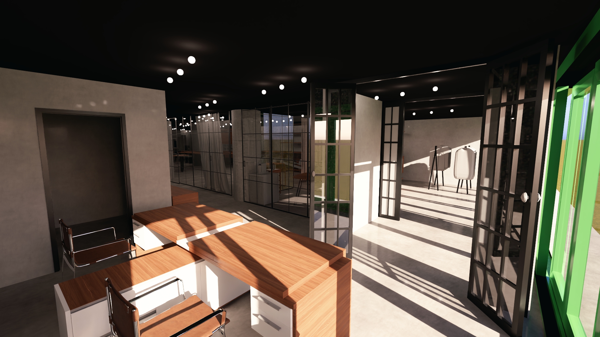 industrial seamstress workshop grey floor concrete walls and columns black framed glass doors facade window frames green