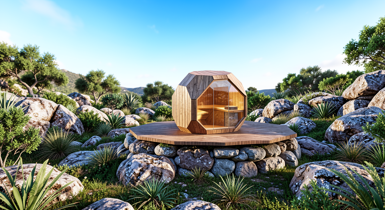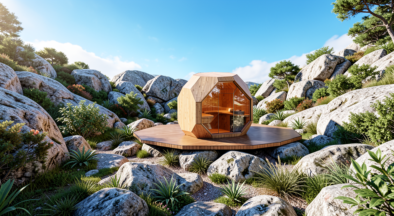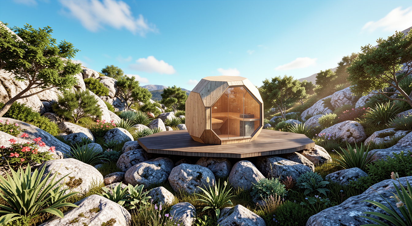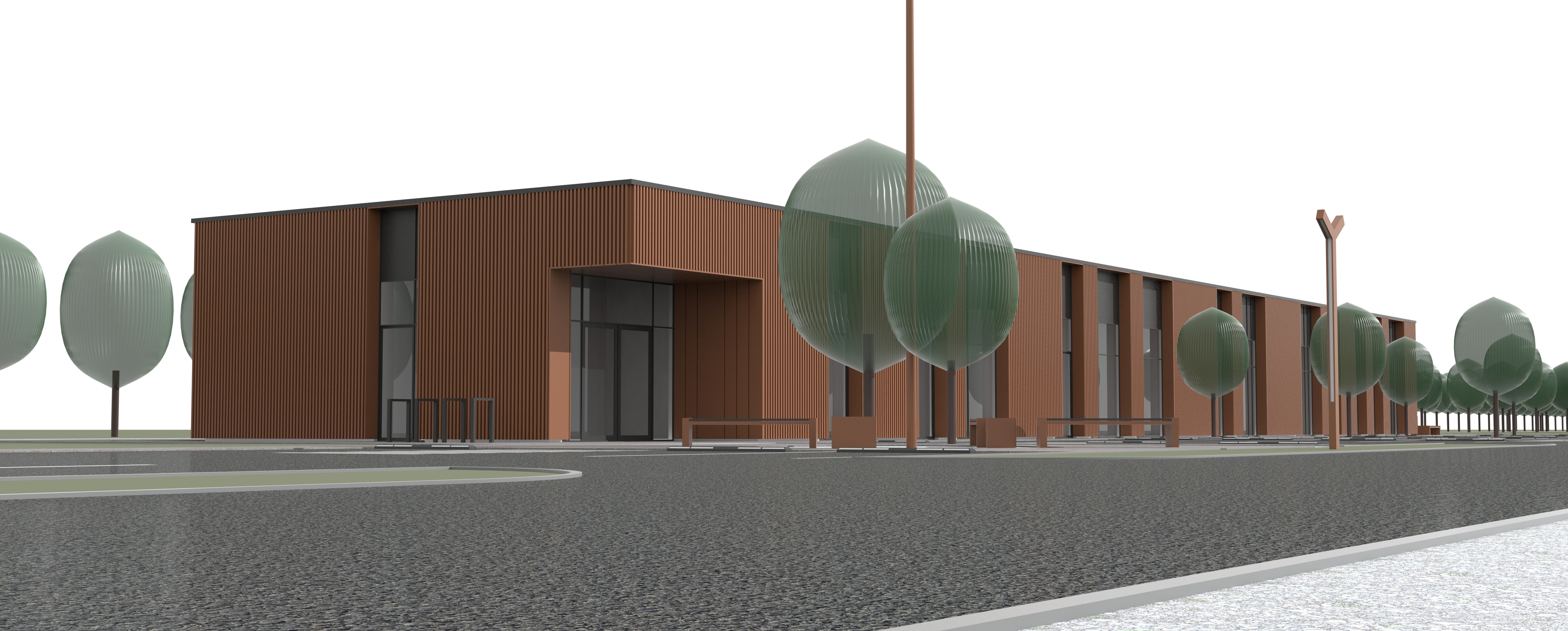 a modern architectural building with a sleek rectangular design featuring vertical profiled corten paneling in warm brown rusty tones large glass windows are integrated throughout the structure reflecting the surrounding environment the setting includes scots pines with soft muted green hues for a contemporary look the atmosphere is serene and slightly overcast with subtle diffused lighting casting gentle shadows the street is paved with smooth dark gray wet with puddles asphalt complementing light white gray decorative gravel that border the road the scene conveys a harmonious blend of nature and urban design