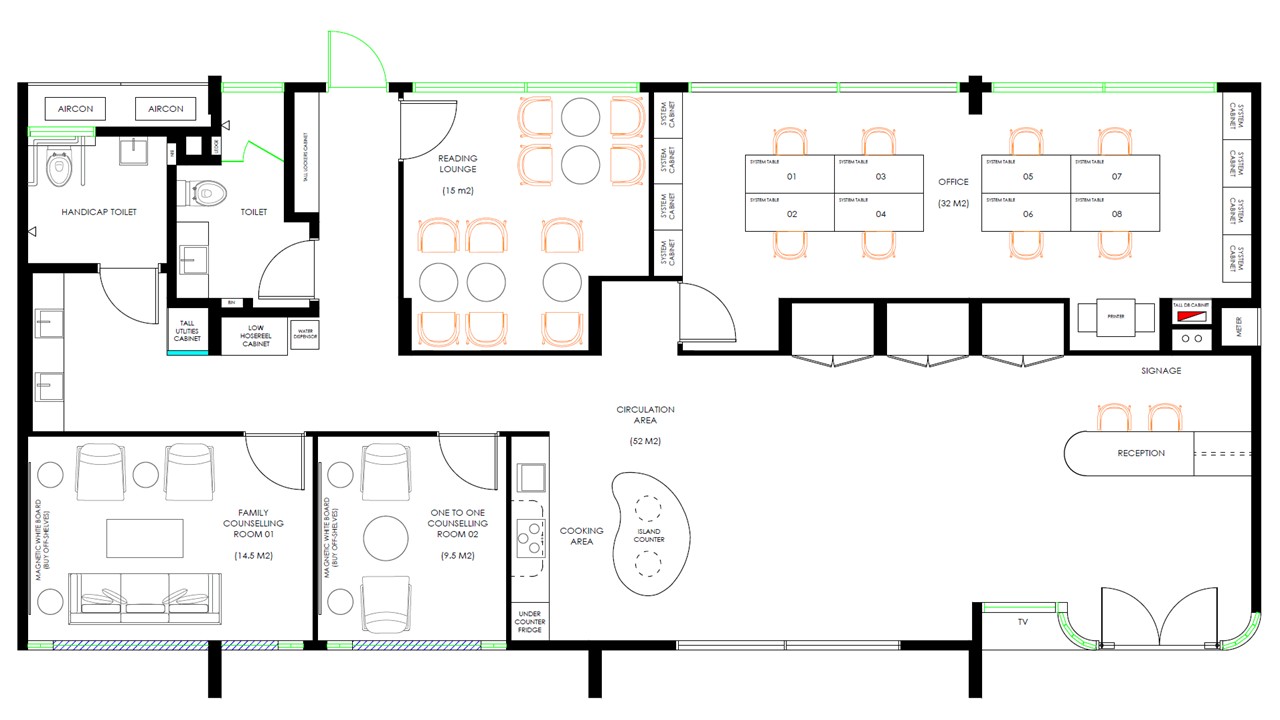 contemporary interior from the top a precise isometric architectural cutaway rendering of filos community unable a hdb void deck there is a reception area open concept kitchen circulation area office 2 consultation room 2 toilet the camera perspective is high and angled revealing the entire interior layout simultaneously the walls are cut away at approximately 2700mm height showing the wall flooring window furnitures include a smooth continuous light oak wood floor across all main areas the scene must have warm soft interior lighting coming from general downlights and natural diffused daylight from windows focus on clean minimalist design with textured materials simple and light colour furnitures throughout the entire rendering should be clean photorealistic and architectural architecture