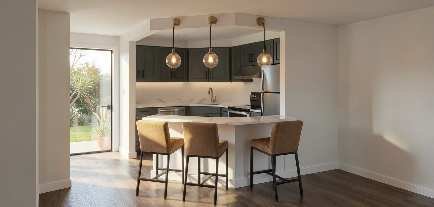 vertical framing expansion extend the image canvas vertically adjustment add approximately 1 5 image height at the top add approximately 1 5 image height at the bottom maintain original width and perspective composition rules keep camera position and focal length unchanged do not zoom out do not change furniture proportions preserve original perspective lines top extension extend ceiling and upper wall naturally continue white ceiling plane maintain soft daylight gradient no new objects or lighting elements bottom extension extend visible floor area downward continue existing tile grid seamlessly preserve tile scale and grout rhythm no distortion of floor perspective continuity constraints seamless architectural continuation no stretching artifacts no new design elements preserve material consistency