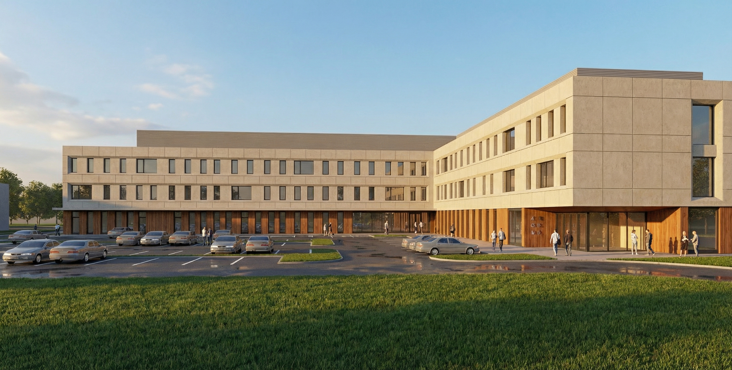lots of light and reflections in the house s windows a backdrop of modern style houses on both sides plenty of sun trees in the background realistic image realistic image