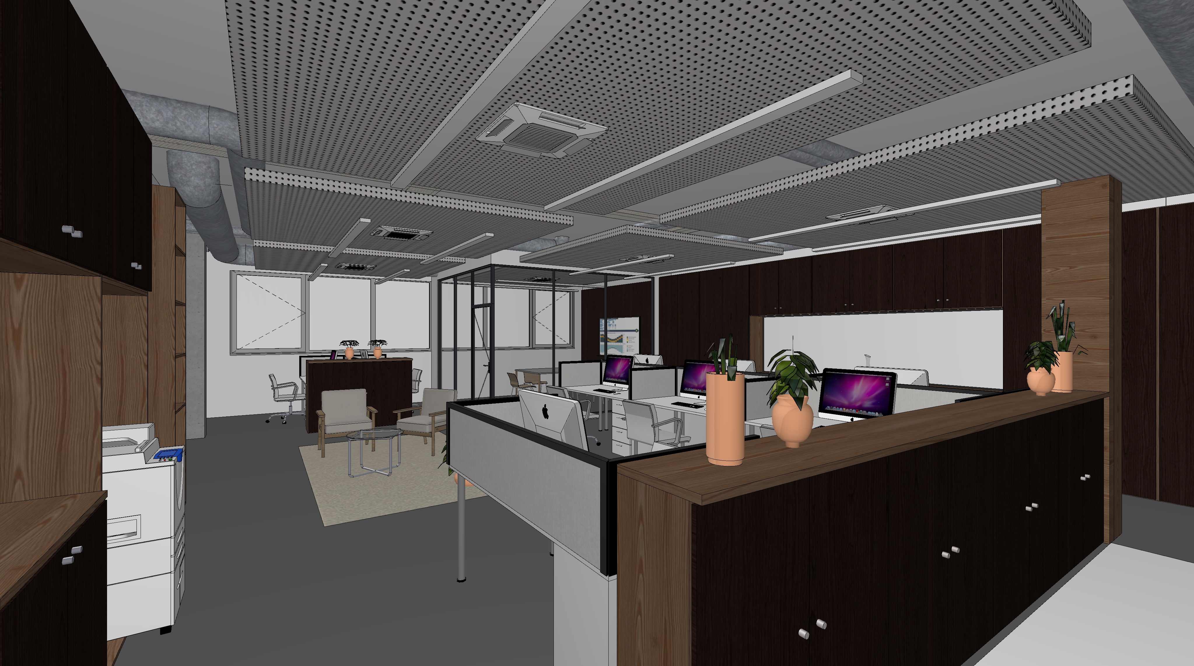professional photorealistic office interior rendering modern open space workplace with dark walnut wood furniture and light wood accents suspended acoustic ceiling with perforated panels and linear led lighting exposed hvac ducts industrial style glass walled meeting rooms imac workstations cozy waiting area with beige armchairs potted plants in terracota pots neutral gray flooring natural daylight from large windows architectural visualization high end corporate office design ultra detailed 8k resolution photorealistic materials realistic shadows and reflections professional interior photography style depth of field ambient occlusion global illumination