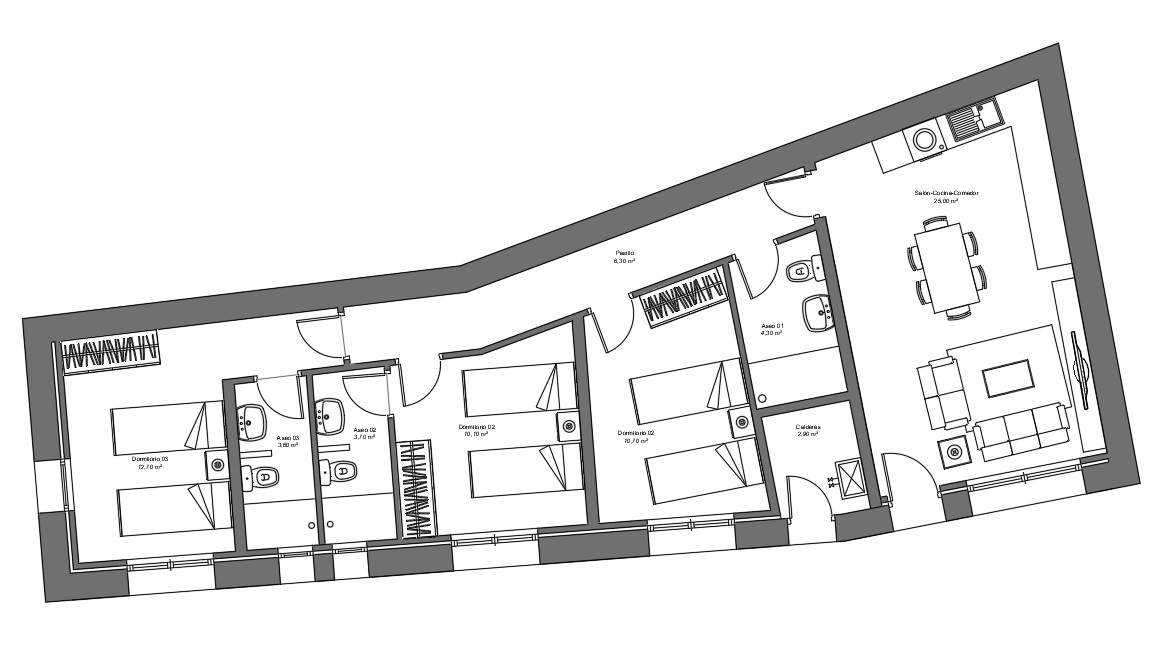 render a modern apartment floor plan featuring a stylish and inviting design use soft neutral tones like beige and cream for walls and floors with dark gray and black accents for modern kitchen appliances include elegant wooden textures for furniture in warm oak tones add lush greenery by incorporating potted plants with deep green leaves bathe the living area in natural sunlight creating a cozy atmosphere with ambient lighting that casts soft shadows incorporate subtle metallics like brushed steel or copper for fixtures and hardware the overall atmosphere should be calm sophisticated and welcoming with an emphasis on minimalism and functionality