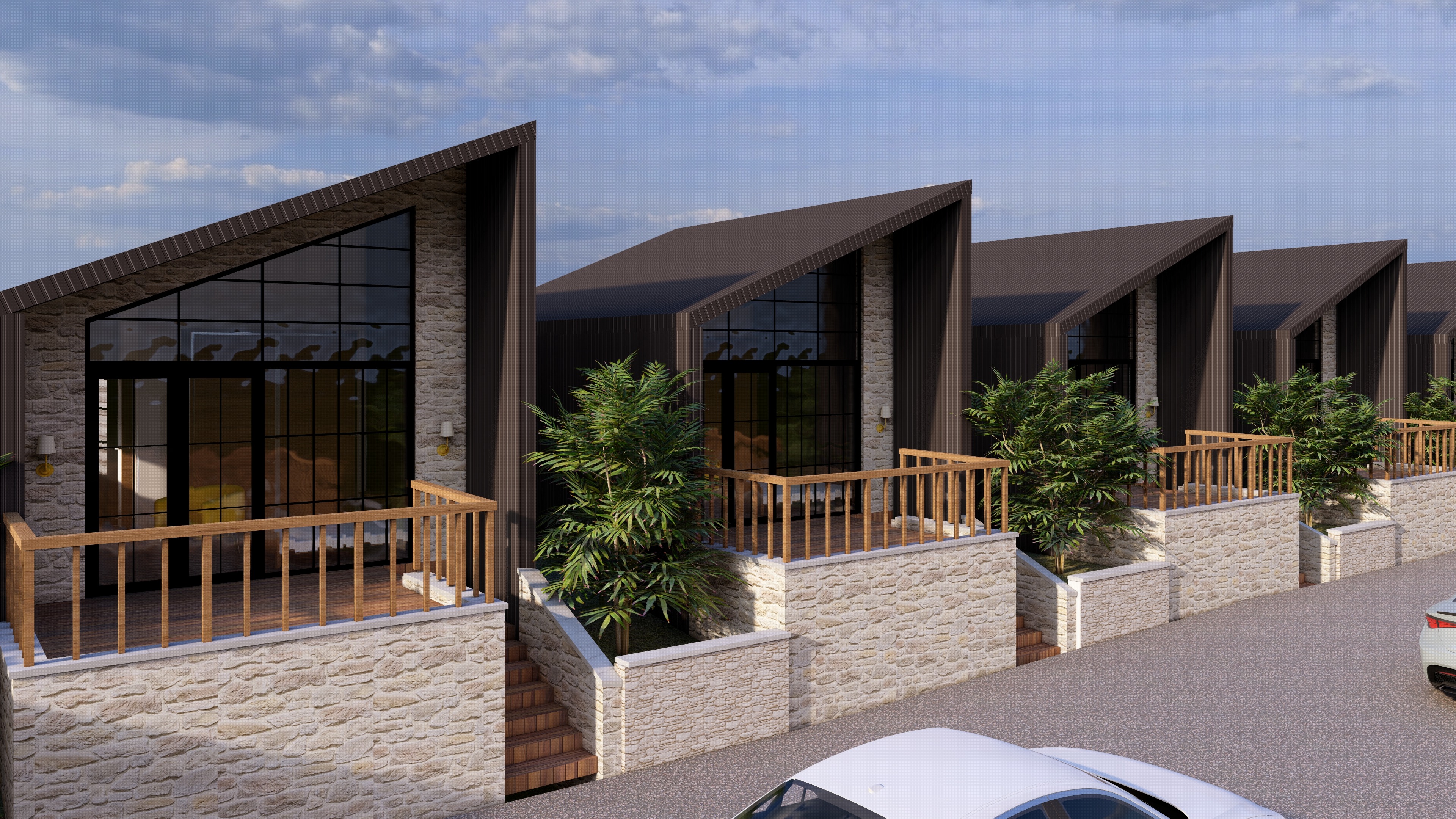 this is an image of a cottage add trees in background and on empty landscape and neat vegetation to give it context add interior creamish warm lighting very low brightness
