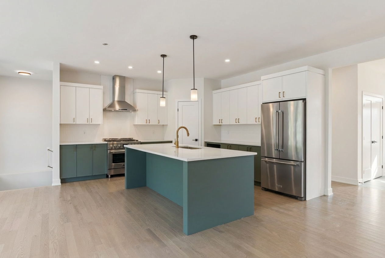 add an interesting light fixture above the island make the countertop more interesting make wall cabinets and base cabinets on range wall a lighter solid color