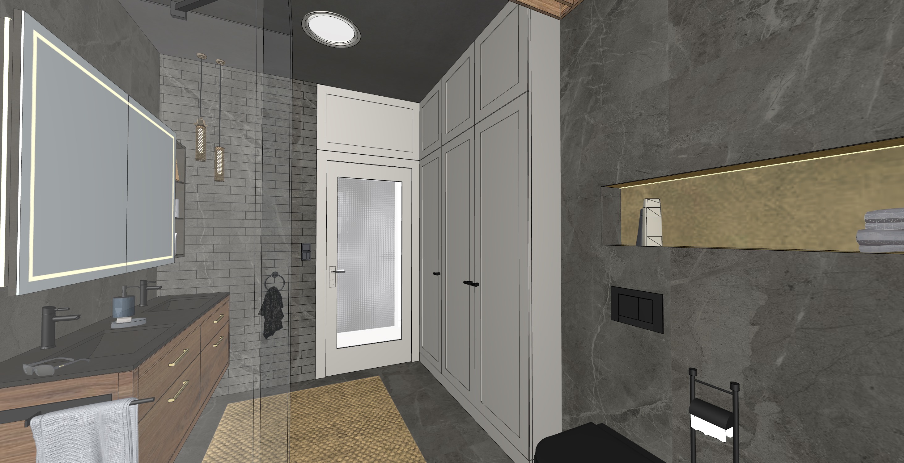 fot realisztikus k p egy modern indusztri lis kieg sz t kkel berendezett f rd r l ne v ltoztass a modellen s t t intim hangulat t r k rben fekete plasztikus has tott pala hat s matt burkolatokkal fekete m zas ker mia szaniterekkel matt fekete csaptelepekkel s zuhany szettel a padl is fekete matt pala hat s tl tsz enyh n t kr z d vegkabin fal friss apr v zcseppekkel az veg alj n a zuhanyz ban egy kisebb v zfolt a padl n vonalmenti fekete design foly ka a falsarokban a mosd pult feletti t k r s kja m g tt rejtett meleg f ny vil g t s a t k r el re is vil g t a wc nyom lap feletti falf lke csiszolt rusztikusabb rezes arany f m fel let a f lke fels h ts l ben elhelyezett rejtett led vil g t ssal kiemelve a falra szerelt mosd pult eur pai di fel let matt arany foganty kkal a b tor alj n lefele vil g t tompa meleg f ny led vil g t s van a sz nyeget cser ld le egy meleg barn ssz rke puha magassz l vel ros hat s f rd szoba sz nyegre a szekr ny s ajt fel lete sz rk s ol va az ajt strukt r lt vege sz rtan tsejlik az ajt n meleg mesters ges f ny sz r dik be a mennyezeti vil g t test halv nyan vil g t