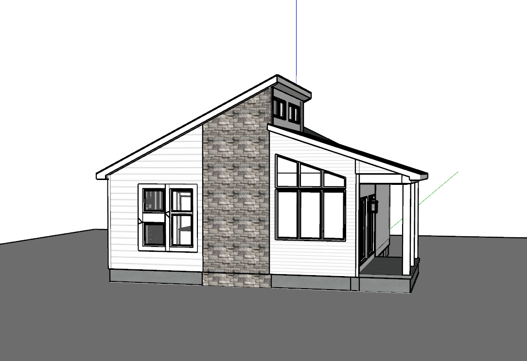 make as photorealistic as possible while keeping textures the same as selection professional landscaping in a lightly wooded scene with good lighting match materials to plan and remove any text dark grey siding black trim black windows