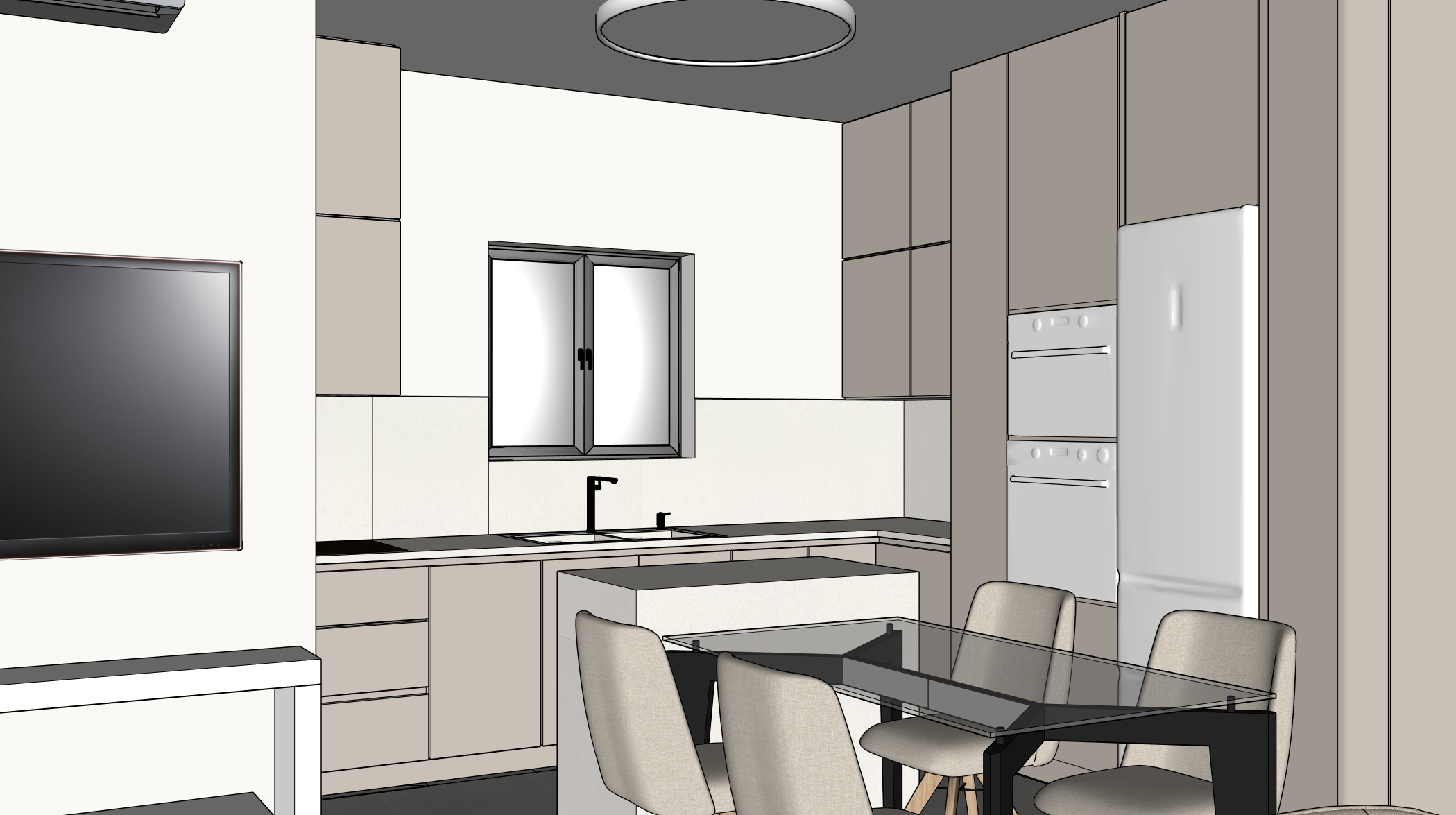 a modern minimalist kitchen interior design in a warm inviting atmosphere use soft beige and taupe for the cabinets and walls complementing with a clean crisp white for the countertops inox fridge and oven and microwave incorporate a sleek matte black for the faucet and light fixtures the dining chairs are upholstered in light beige for a cozy touch paired with a glass top table supported by black steel legs the floors have a polished gray finish natural light floods through the window casting soft warm shadows creating a serene and elegant environment mirror at the wall next to the entrance door remove the lights from the ceiling
