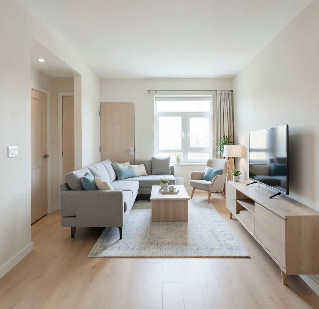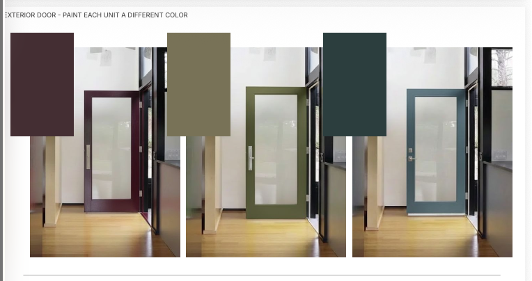 remove all color swatches and floating blocks above the doors clean up the composition so only the three door options remain evenly spaced and aligned enhance each image into a realistic high quality interior rendering with consistent lighting across all three versions improve materials such as door paint glass metal hardware and wood flooring to look more realistic and premium ensure colors remain accurate but appear natural and refined add soft even lighting and subtle shadows for depth final result should look like a clean architectural comparison of three finished door options in a real home setting keep the layout simple balanced and presentation ready