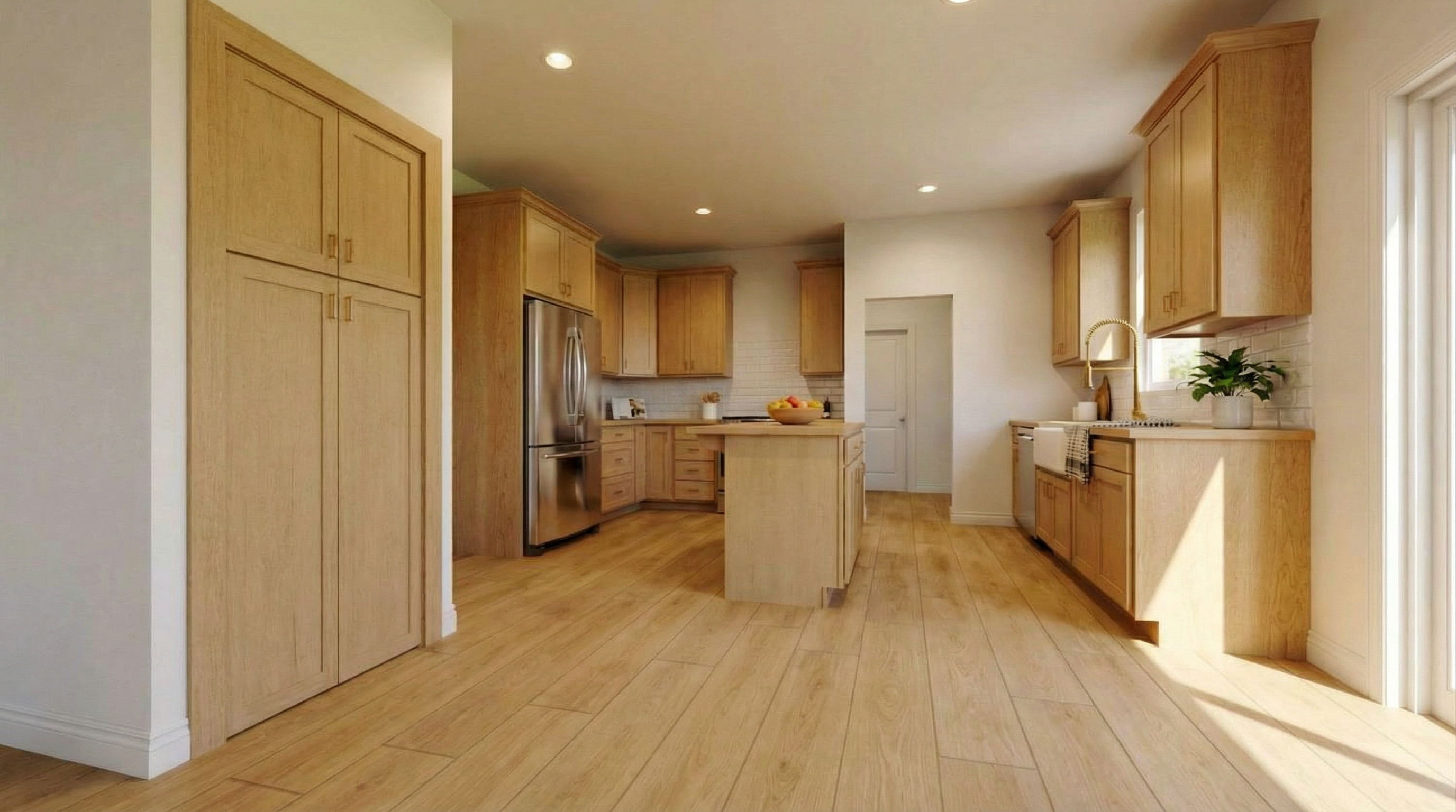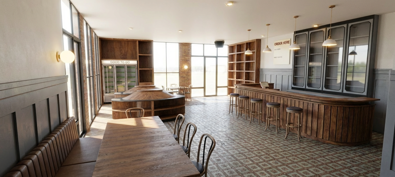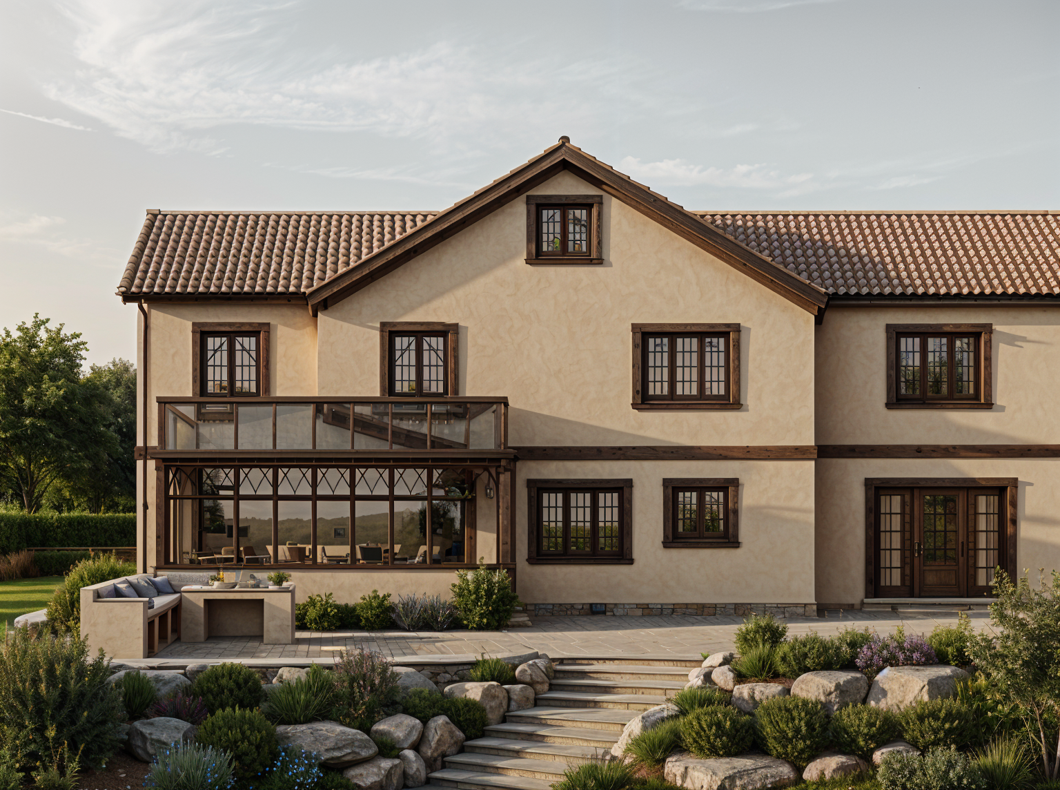 render the space in hyper realistic visualization quality at 8k resolution keep the materials as they are make the outdoor look more realistic still with trees make the window frame more realistic