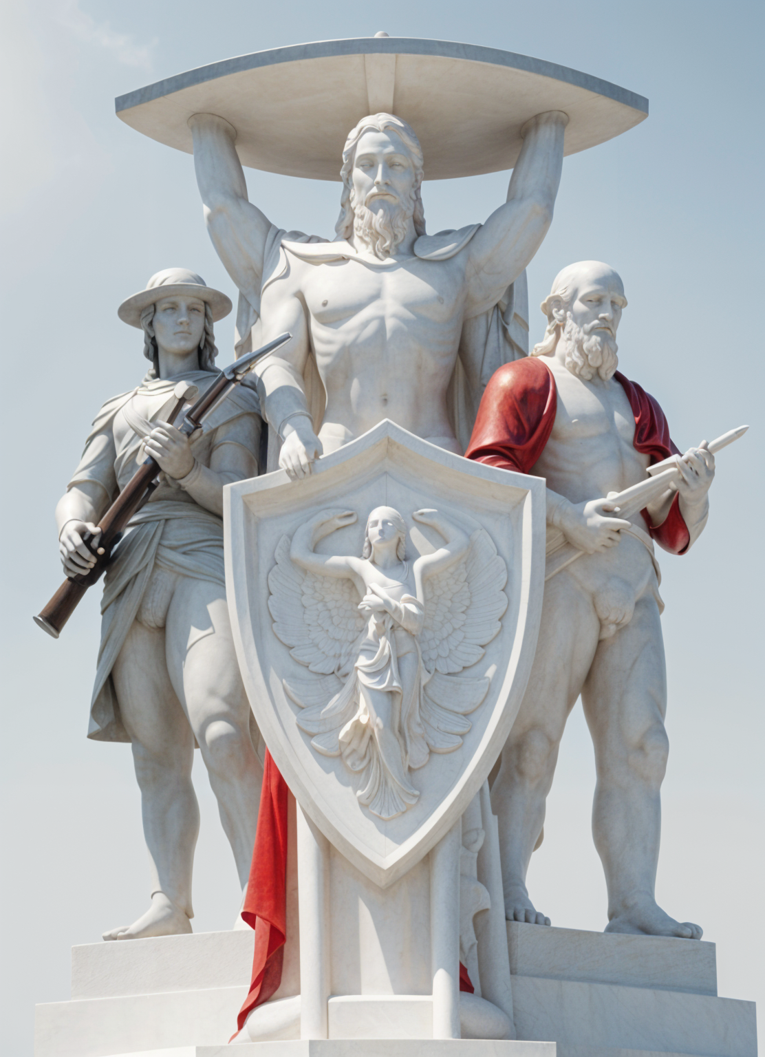 bauhaus exterior shot plastic russian statue minimalism in white red and blue colors warriors from different eras of russi architecture