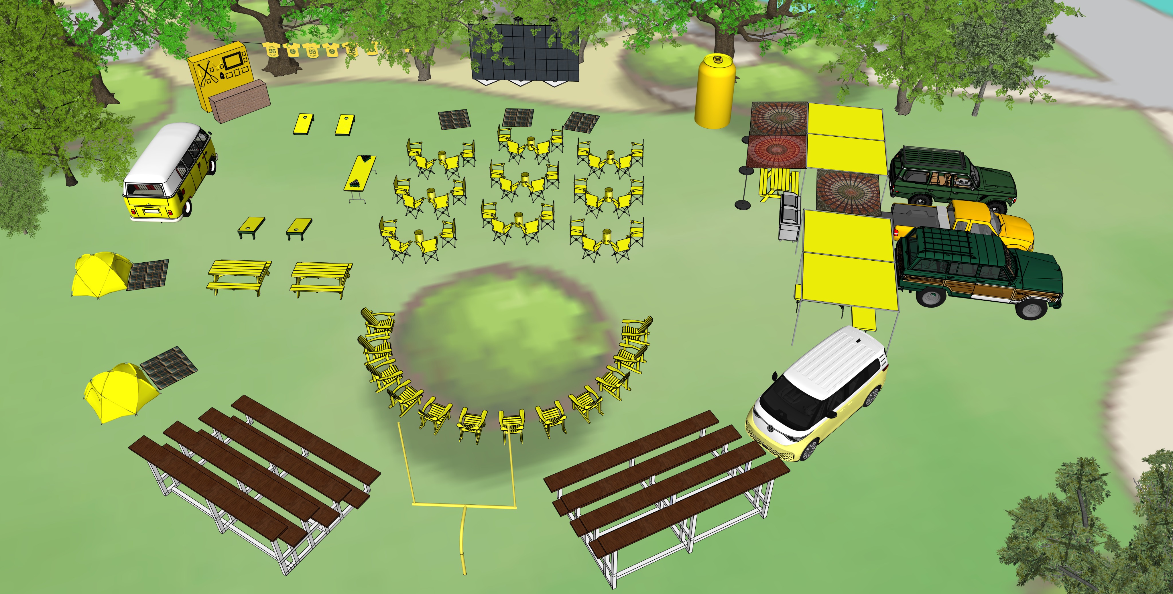 setup up this tailgate event in the woods set at oak canyon ranch in california set in deep oak trees make the surrounding area lush with lost of foliage have smoke coming from the grill next to the yellow tent and put a football game on the black box