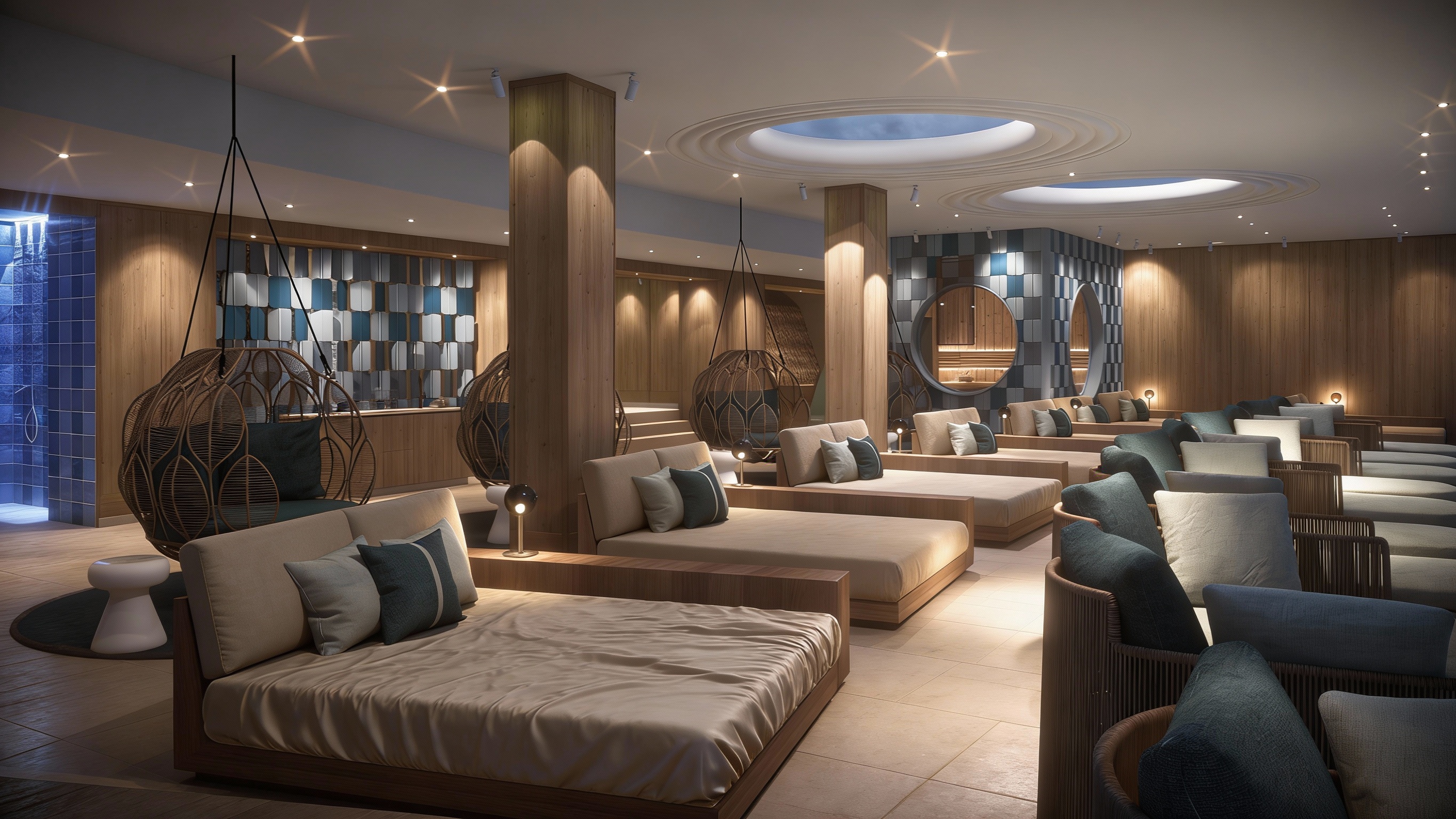 the space is an open hotel lobby loft library shelves with artwork displayed directly on the shelf walls and lit with library lights see reference images for overall design vibes and the artwork to be displayed