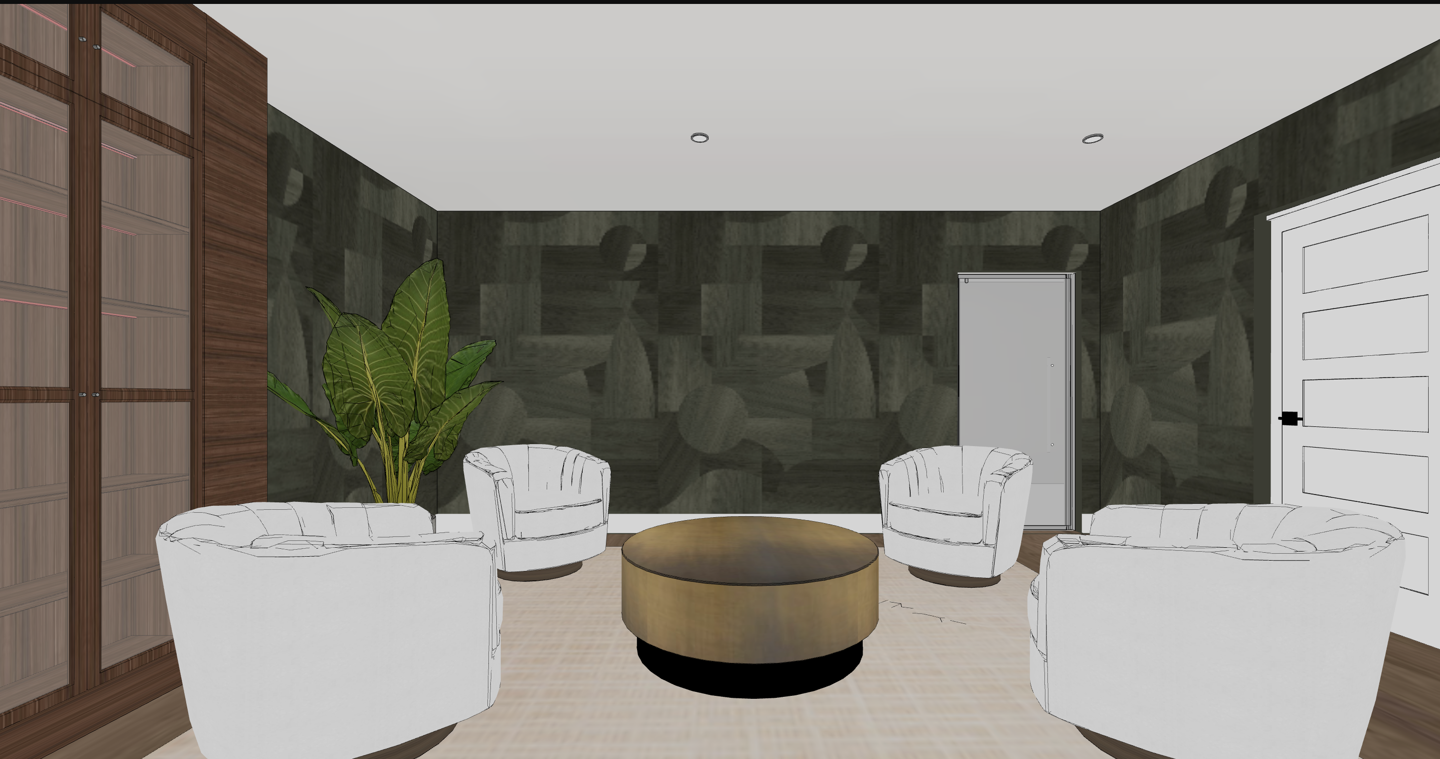 generate a realistic rendering of this space do not change the textures furniture or anything else just enhance it and make it more realistic the walls have a wallpaper from belarte studio called wood art green oak add led lighting to the bookcases on the left and add recessed lighting the round coffee table is modern steel coffee table from west elm brass finish and the chairs are the bennett swivel club chair from west elm on white fabric right door is solid and back door is glass the coffee table is brass color and no reflection accent chairs are swivel no legs
