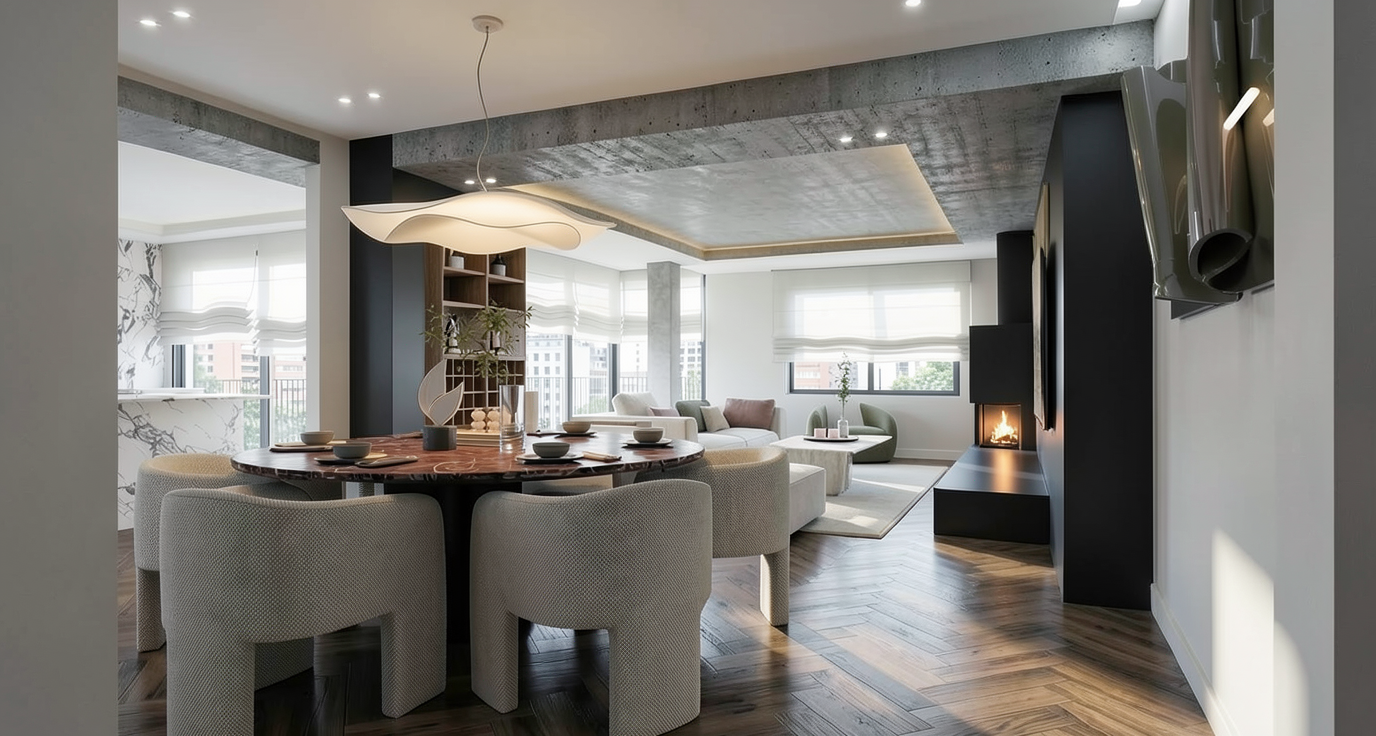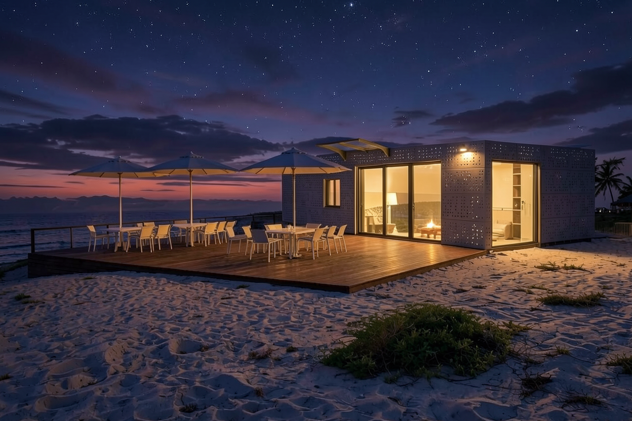 zaha hadid exterior shot generate a beautifully rendered urban landscape with varied white buildings arranged on a hilly terrain use warm earthy brown tones for the ground and deep charcoal gray for the river flowing through the town surround the area with a smoothly curving road in dark olive green with subtle white markings set the scene in a serene early morning atmosphere with soft ambient lighting to create a peaceful and balanced scene the green space is characterised by a steeper gradient the area in front of the road is designated as a coastal restoration zone while both sides are allocated as residential zones this is a newly introduced road designed to establish a clear internal access structure within the development the building is 4 storey residential building architecture