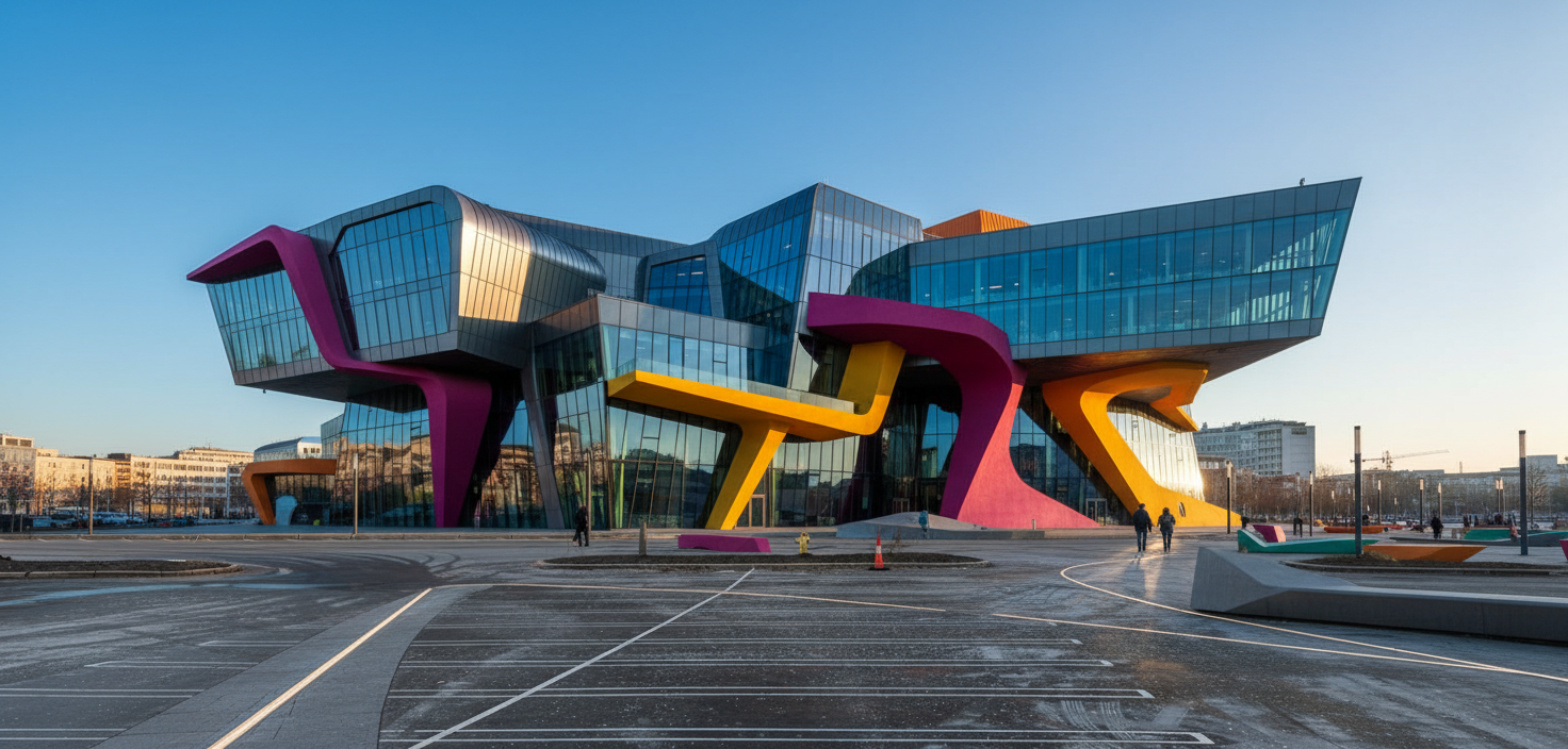 modern exterior shot a front corner render more towards the front of the two images combined the left image is the front elevation and the right image is the right elevation gray neutral tones setting would be a neutral background the front porch entry stairs to towards the left of the building architecture