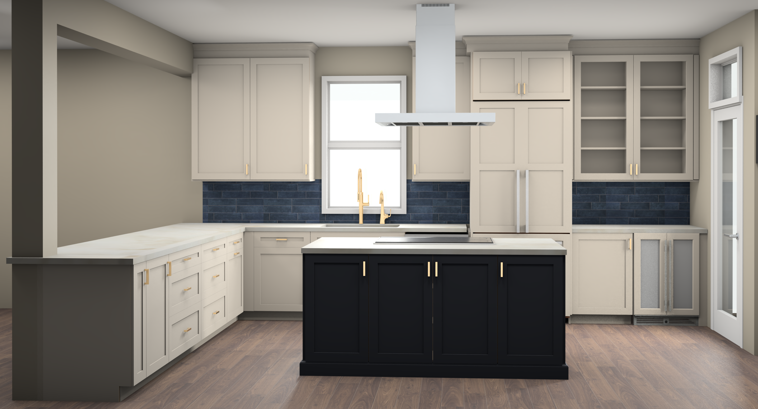 make more realistic make island navy blue add tree add bar accessories inside glass doors add drinks to undercounter refrigerator