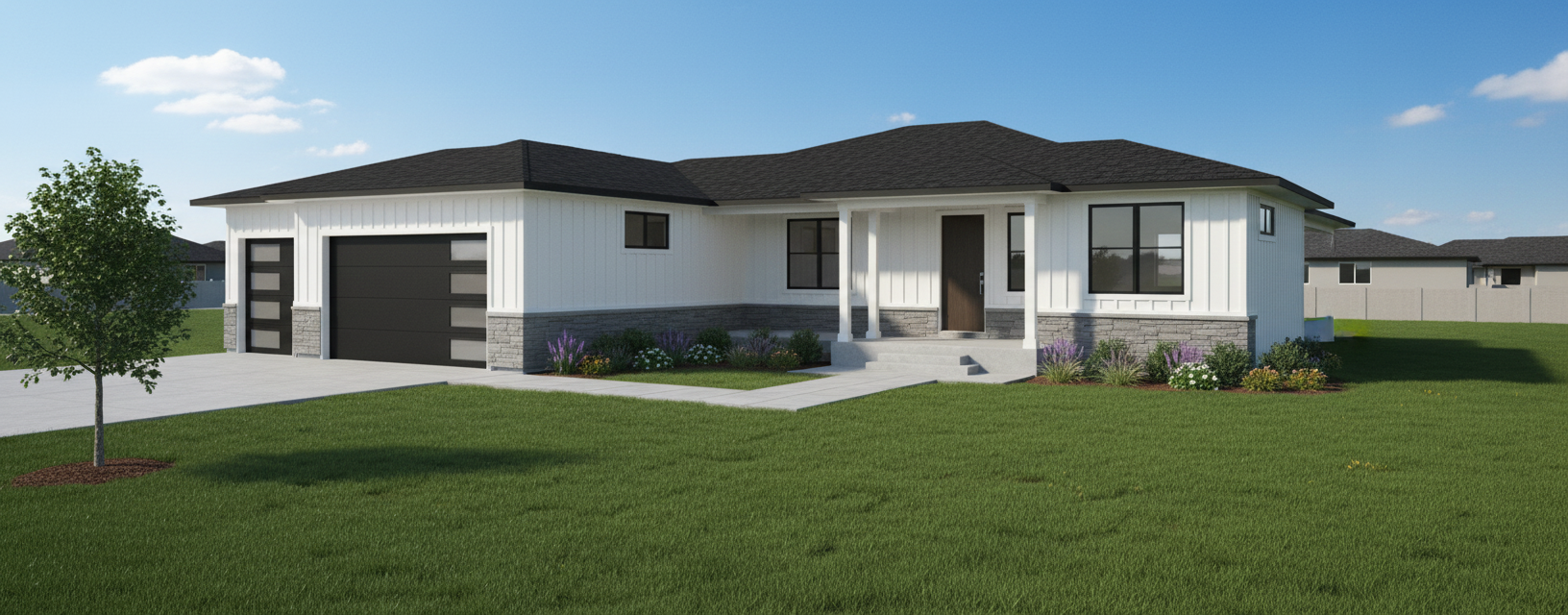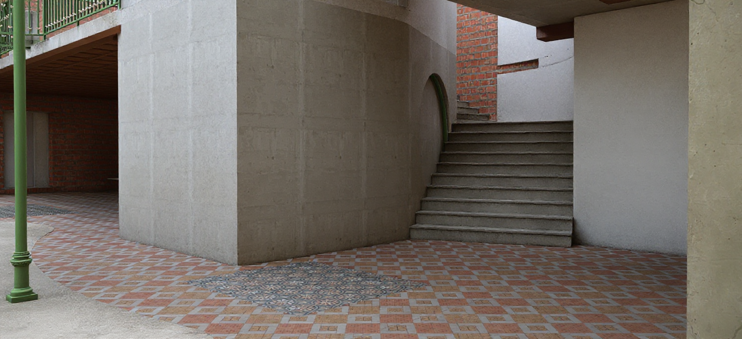 keep the exact architecture camera angle and layout the same desaturate the sky so the blue is much softer and lighter with a few subtle clouds not bright or cartoonish remove the yellow orange color cast from the concrete tables chairs pergola and shadows make the concrete a neutral light gray and keep the wood of the chairs a natural warm tone not orange make the background residential building more realistic with sharper fa ade detail clearer window frames realistic reflections and stronger contrast so it looks less flat increase realism of plants and vines with more texture and depth without changing their positions do not move or reshape any elements only adjust color contrast and realism