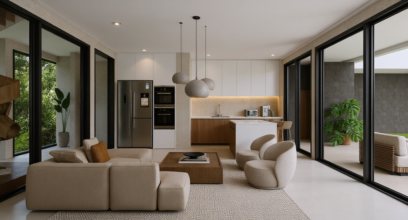 render this to a realistic quality using material palletes such as concrete wood stone all that any cyan colors should be a concrete based planters that sit staggered on the main staircase any red should be a darker staggered stone texture the yellow should be the wooden facade panels the orange is roof underneath a large cantilever add rigid simple lights underneath that illuminate the stairs the dark blue is the sky the green is also staggered stone walls in the background render the plaza structure as wood too